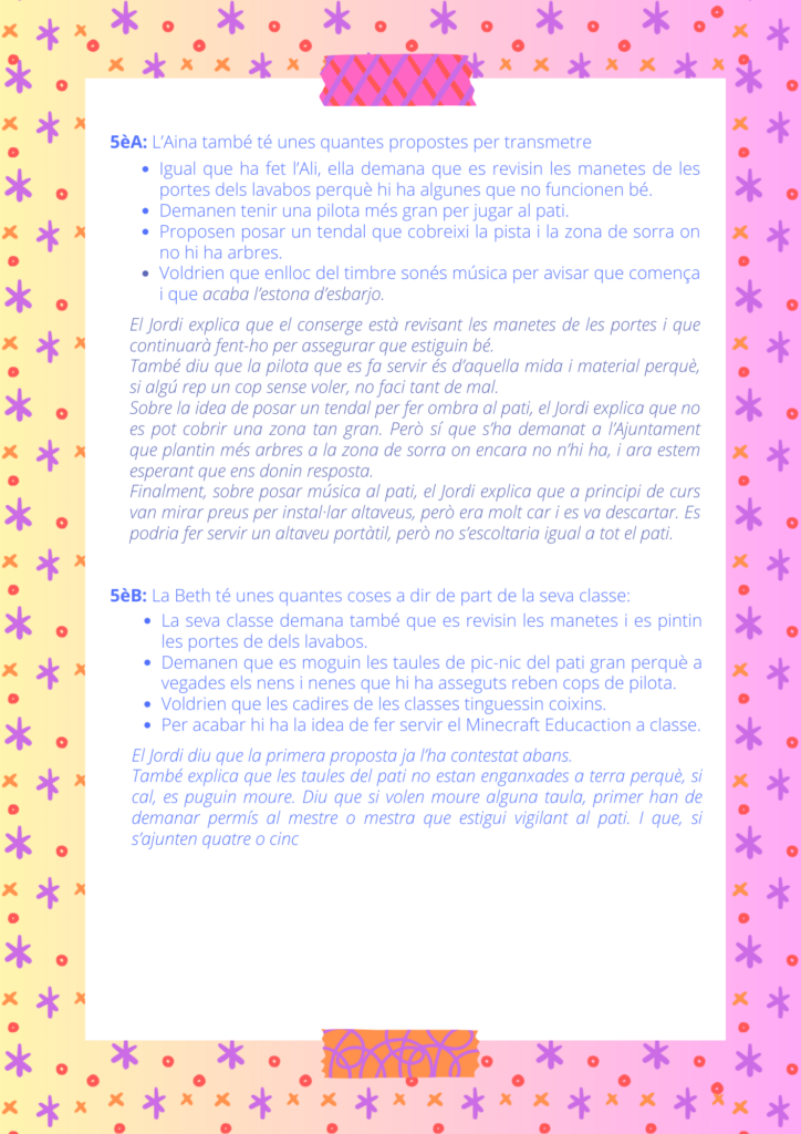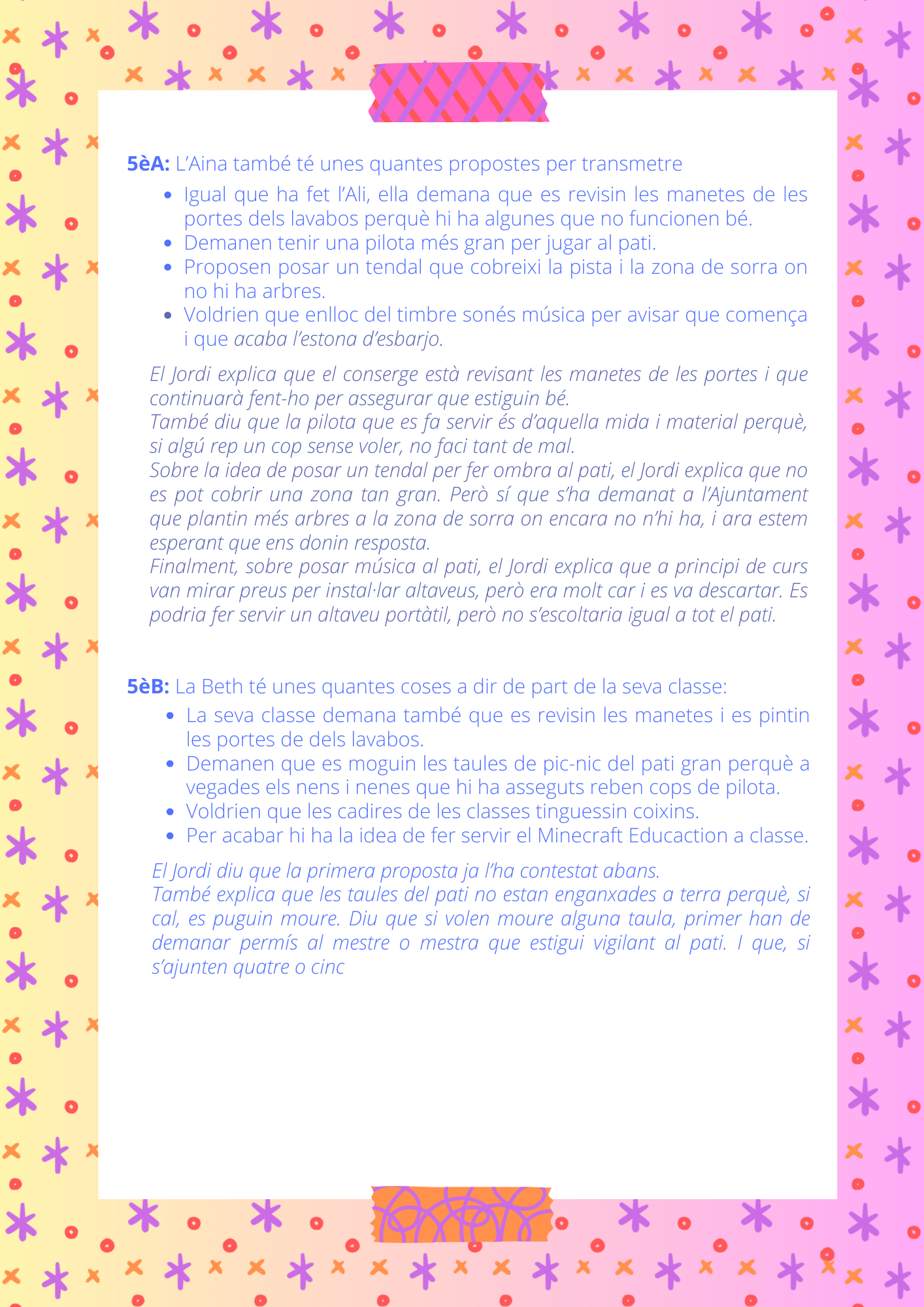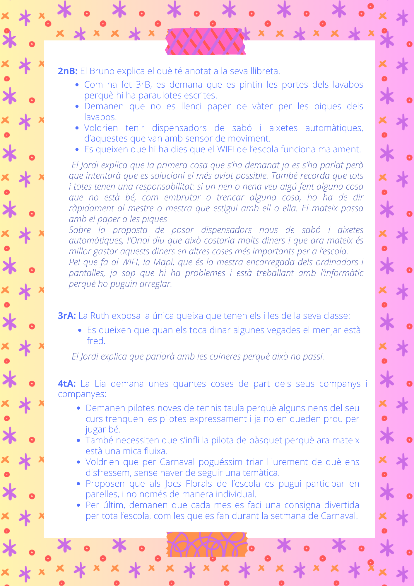 Durant la trobada, es van recollir noves propostes, com ara la necessitat de pintar les aules i els lavabos, posar més sorra al pati, instal·lar dispensadors de sabó al menjador, millorar la connexió WIFI i revisar alguns espais com la biblioteca o el pati del menjador. També es van plantejar activitats com la creació d’una petita biblioteca a l’espai exterior, l’organització de consignes mensuals divertides o la possibilitat de participar als Jocs Florals en parelles.