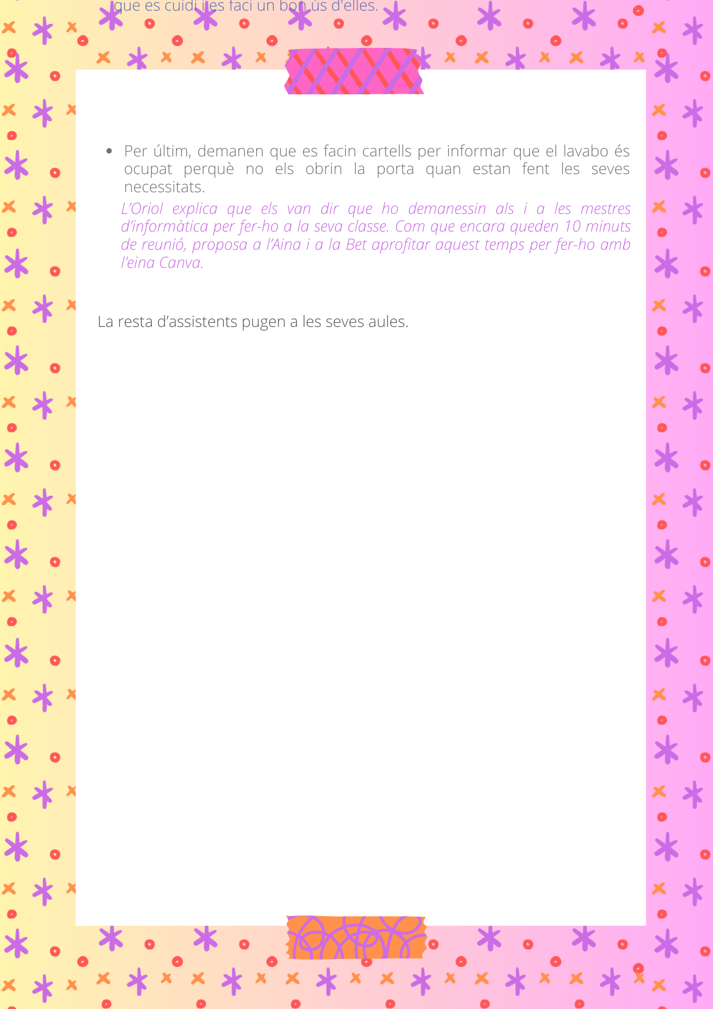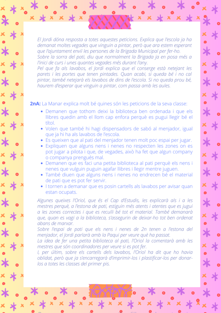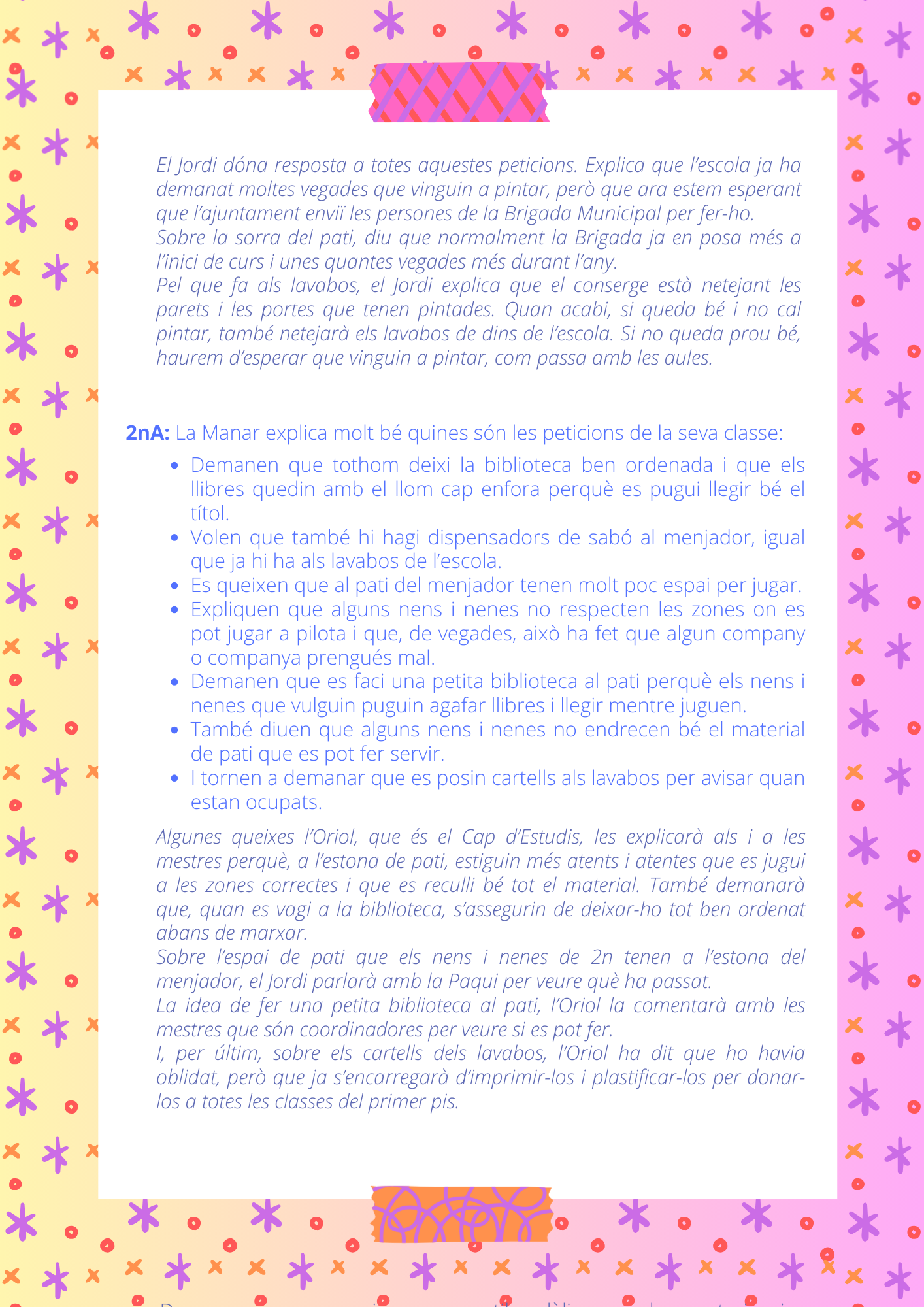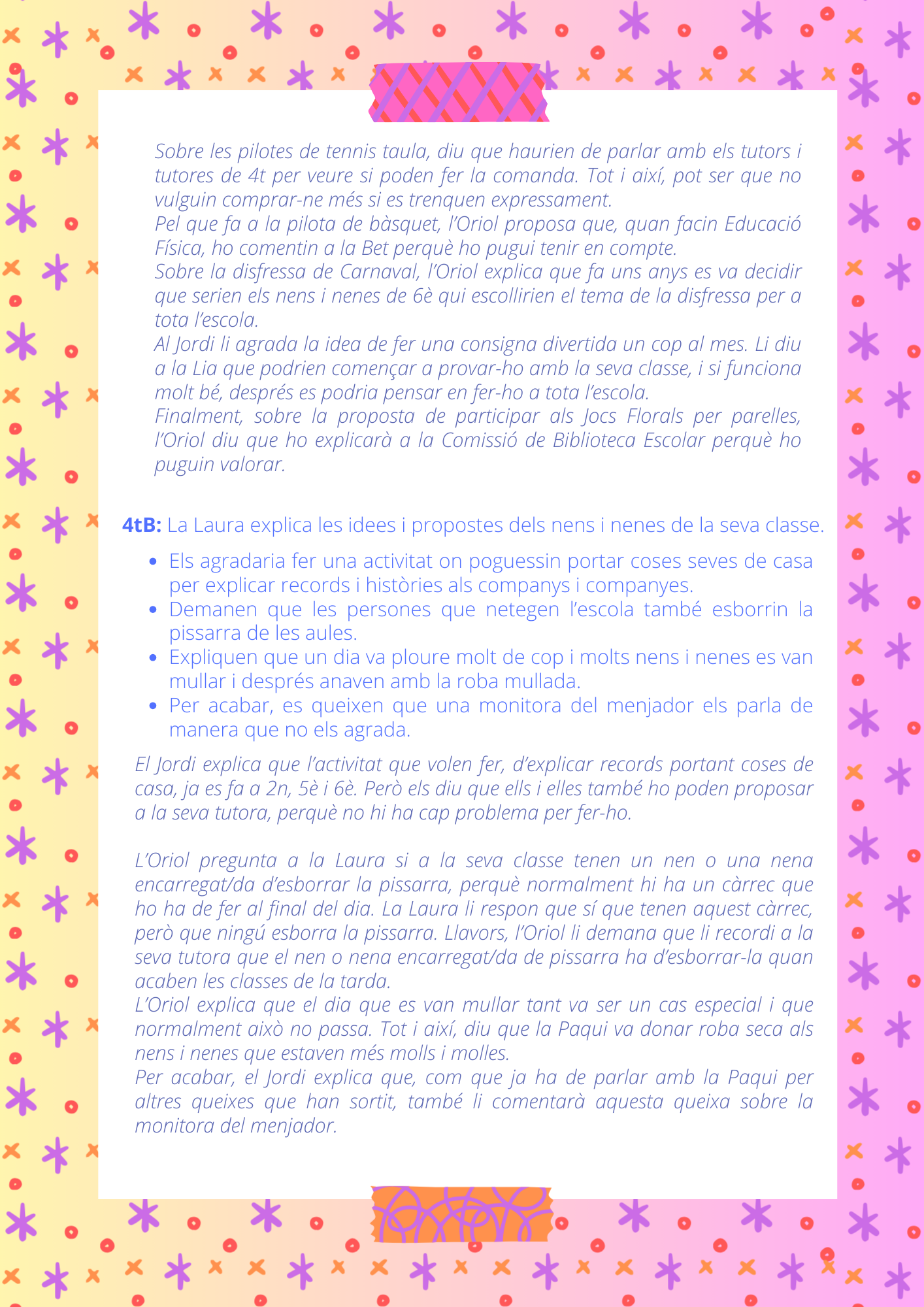Durant la trobada, es van recollir noves propostes, com ara la necessitat de pintar les aules i els lavabos, posar més sorra al pati, instal·lar dispensadors de sabó al menjador, millorar la connexió WIFI i revisar alguns espais com la biblioteca o el pati del menjador. També es van plantejar activitats com la creació d’una petita biblioteca a l’espai exterior, l’organització de consignes mensuals divertides o la possibilitat de participar als Jocs Florals en parelles.