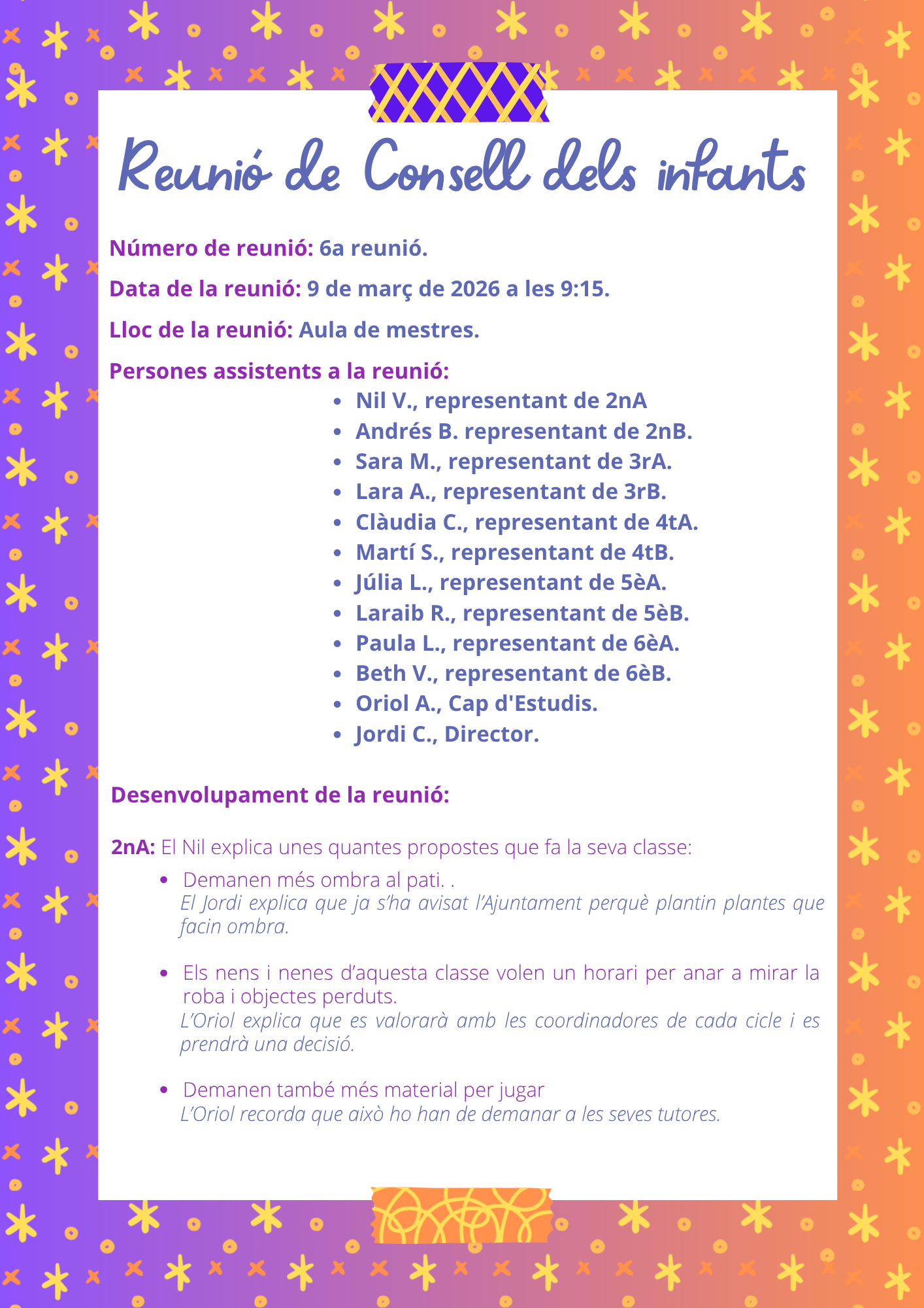 El passat 9 de març es va celebrar una nova sessió del Consell dels Infants de l’escola, un espai de participació on els representants de cada classe comparteixen propostes, inquietuds i idees per millorar el dia a dia del centre.