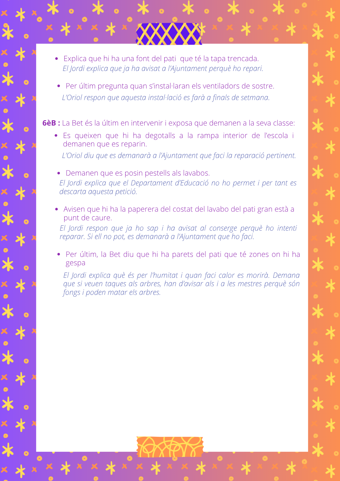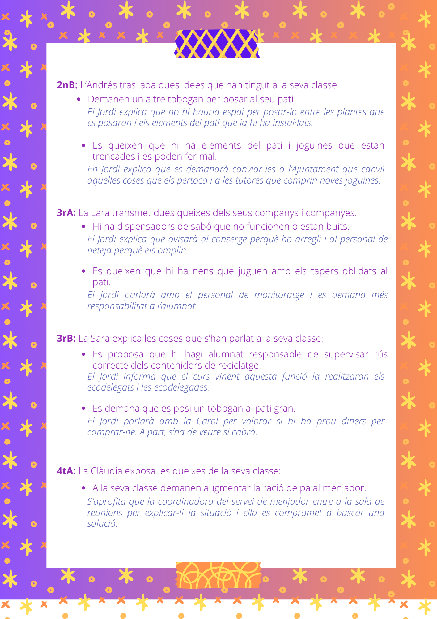 El Consell també va ser un espai per reflexionar sobre la convivència. Es van plantejar propostes per fomentar el bon ús dels materials i dels espais, com la creació de figures responsables del reciclatge o la necessitat de tenir cura dels objectes comuns.