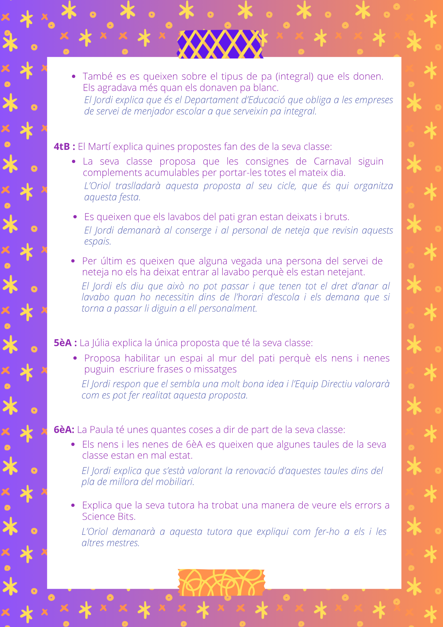 Altres propostes van fer referència a aspectes del funcionament quotidià, com el servei de menjador, l’estat del mobiliari d’algunes aules o l’organització d’activitats escolars com el Carnaval.