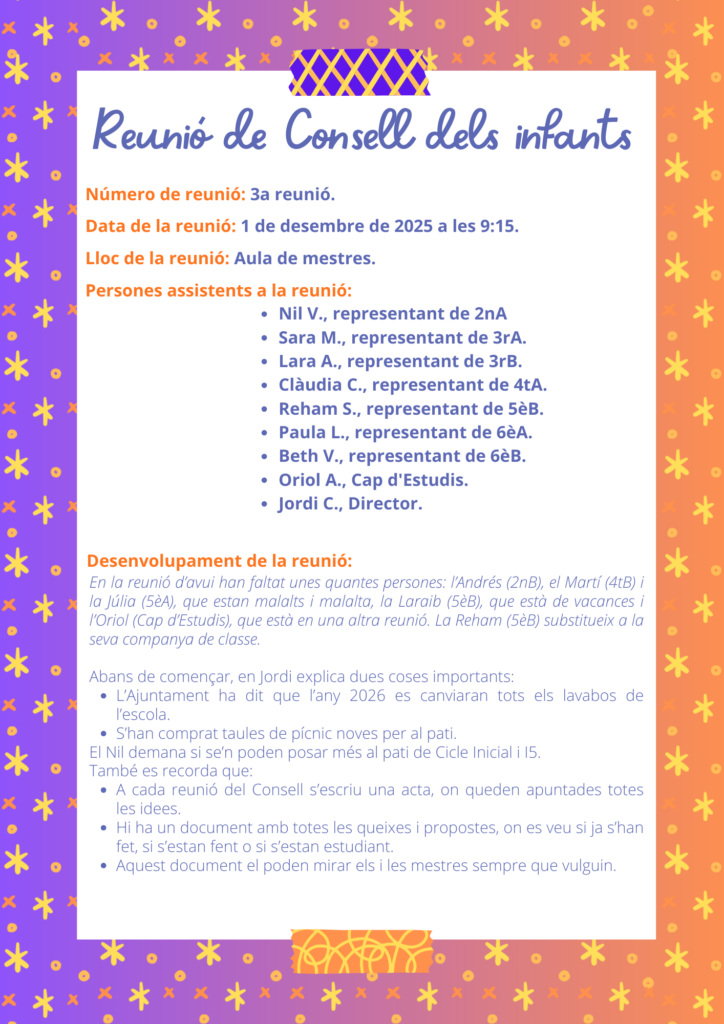El passat 1 de desembre de 2025 es va celebrar la tercera reunió del Consell dels Infants d’aquest curs, a l’aula de mestres. Hi van participar els i les representants de les classes de 2n a 6è, acompanyats pel director, en Jordi, i el cap d’estudis, l’Oriol.