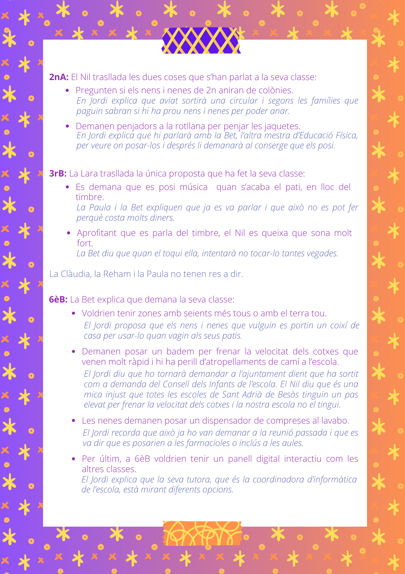 • 2nA va preguntar si faran colònies. En Jordi va dir que aviat sortirà una circular i, segons les inscripcions, es podrà saber si es poden fer. També van proposar tenir seients o terres més tous al pati, i es va suggerir que qui vulgui es pugui portar un coixí de casa.