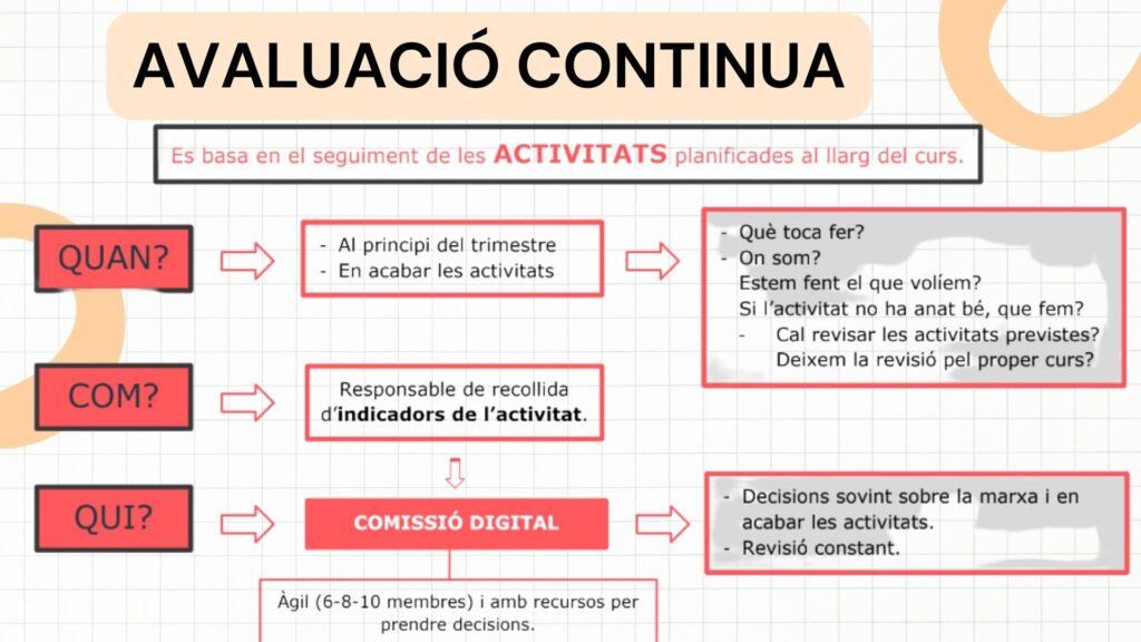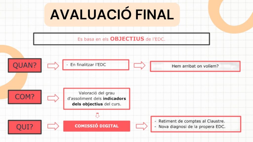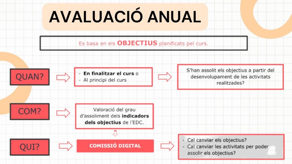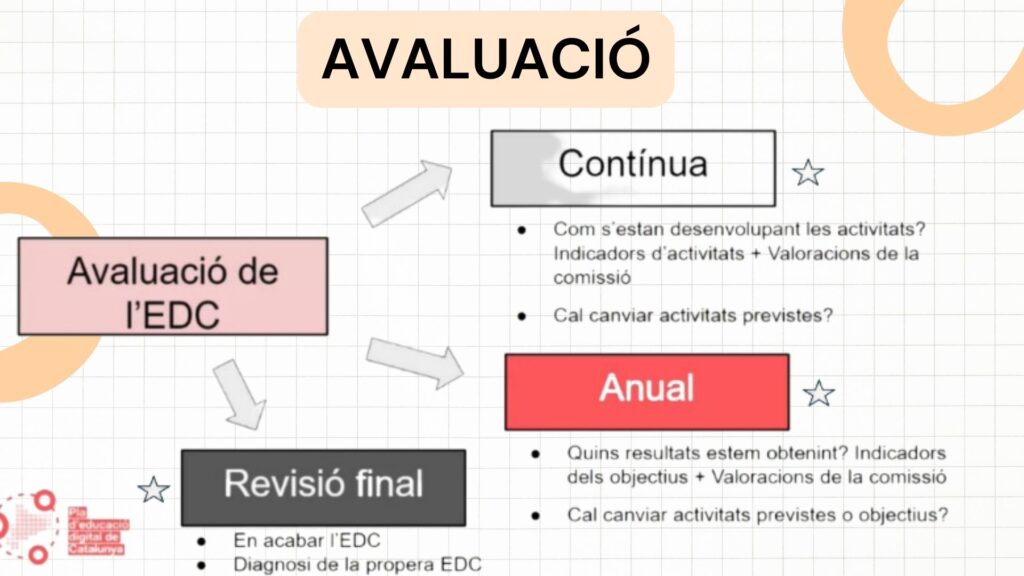 Des de la Comissió Digital es farà, en la mesura del possible, una avaluació anual de tota l’Estratègia Digital de Centre. Caldrà revisar tant les actuacions planificades com el grau d’assoliment de les mateixes i si fos necessari es farien els canvis necessaris ja que la nostra EDC és un document viu.