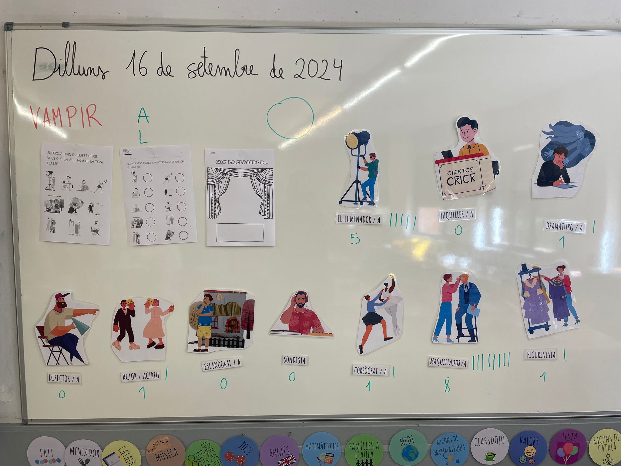 Al llarg de les sessions, cada infant ha tingut l’oportunitat de provar algun dels oficis, i així han pogut comprendre la importància de cadascun dins l’univers teatral. En finalitzar el projecte, s’ha proposat una votació per decidir quin dels oficis seria el que més els havia agradat i que, alhora, es convertiria en el nom de la seva classe.