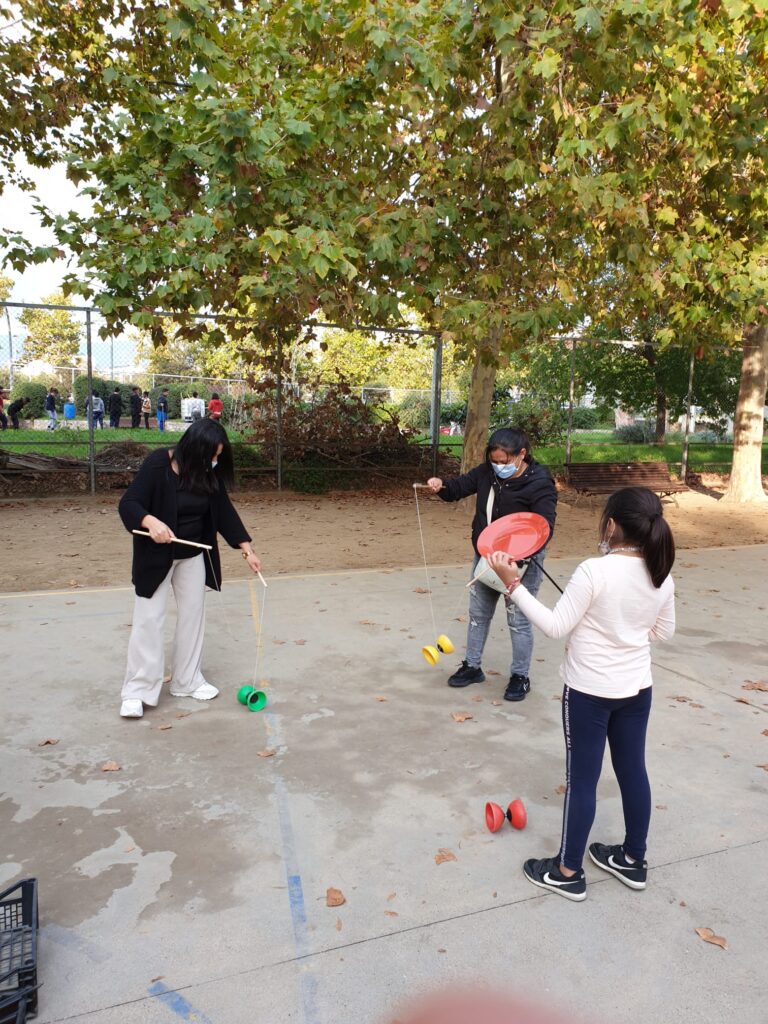 A continuació, ens hem dividit en 4 grups per realitzar 4 estacions. En la primera d’elles hem provat dos material de circ, els diabolos i els plats xinesos. A la segona, hem pogut experimentar una de les habilitats motrius, els salts, que treballem a les sessions d’educació física tot jugant a saltar a la corda. La tercera ens ha servit per conèixer un joc tradicional com és la petanca. A l’última hem jugat amb els frisbees.