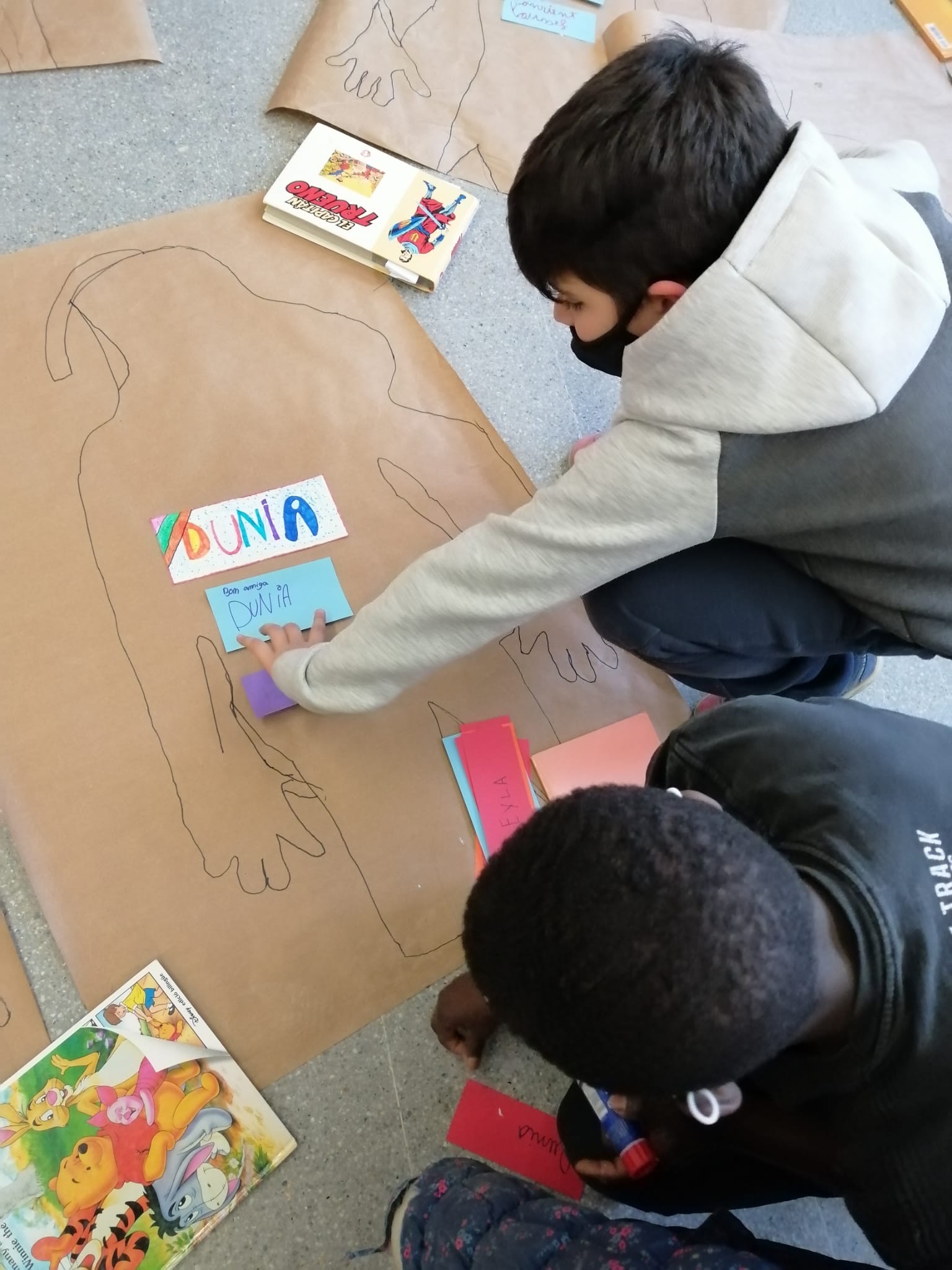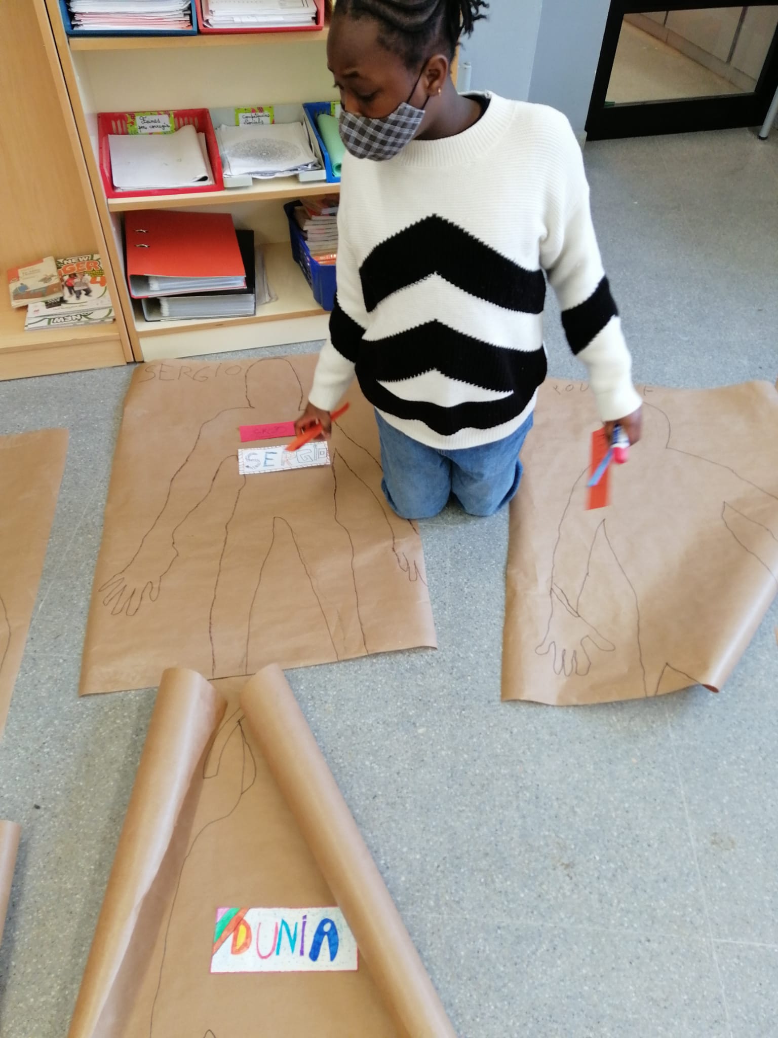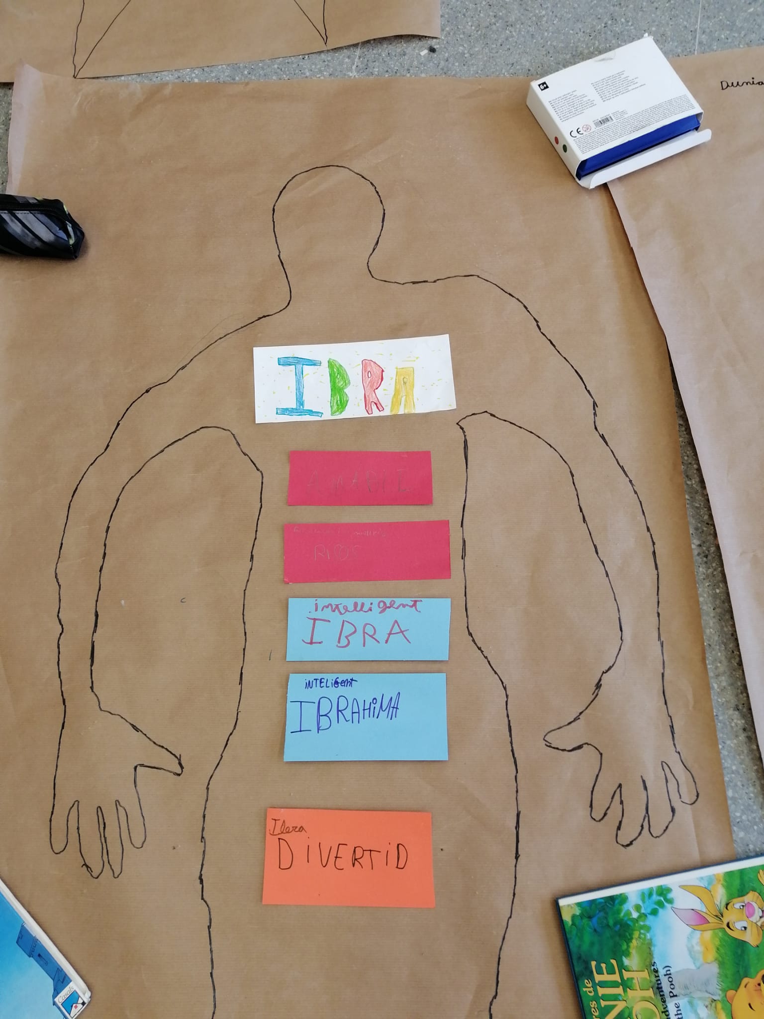 Aquesta setmana les tres classes de 4t vam fer una activitat amb la Vero per conèixer als nostres companys/es. Primer, vam fer una pluja d’idees a la pissarra amb adjectius positius amb els que podiem descriure a la resta de nens/es de la classe. Desprès, vam dibuixar les nostres siluetes en un paper molt gran i la vam pintar de colors. Vam escriure el nostre nom i el de la resta de la classe amb unes cartolines petites. Al darrere de cadascun dels noms vam escriure una paraula positiva i vam enganxar cadascuna de les la targetes a la silueta de cadascun dels nens i nenes de la classe. A tots els nens i nenes ens va agradar molt aquesta activitat!