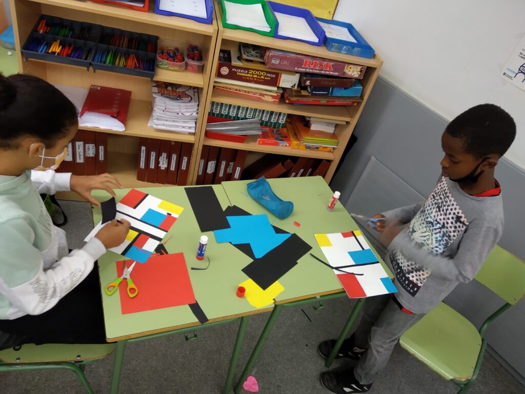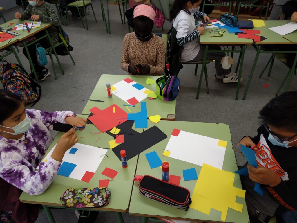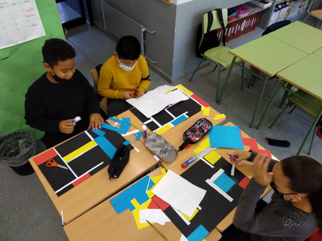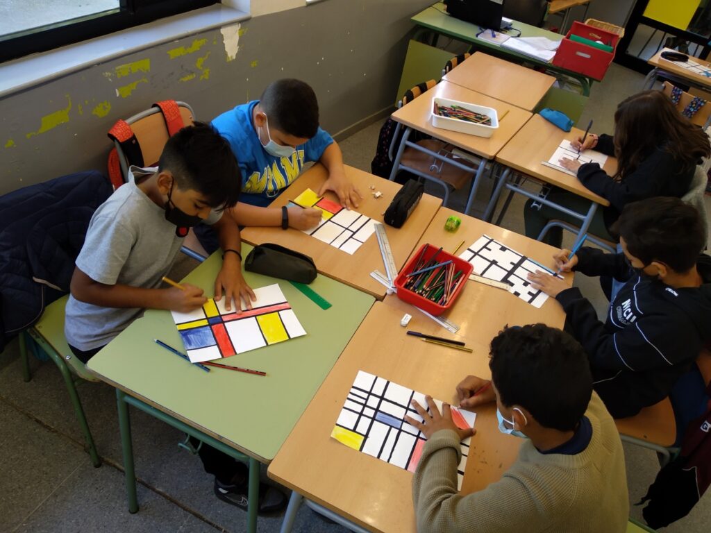 A cinquè hem començat el curs amb dues unitats simultànies: Per una banda hem conegut la obra de Piet Mondrian, un dels artistes abstractes més característics i probablement el que més ha influït en el món disseny gràfic. Amb les seves línies negres rectes horitzontals i verticals, i amb el us pràcticament exclusiu dels colors primaris volia representar un univers en “equilibri dinàmic”!!