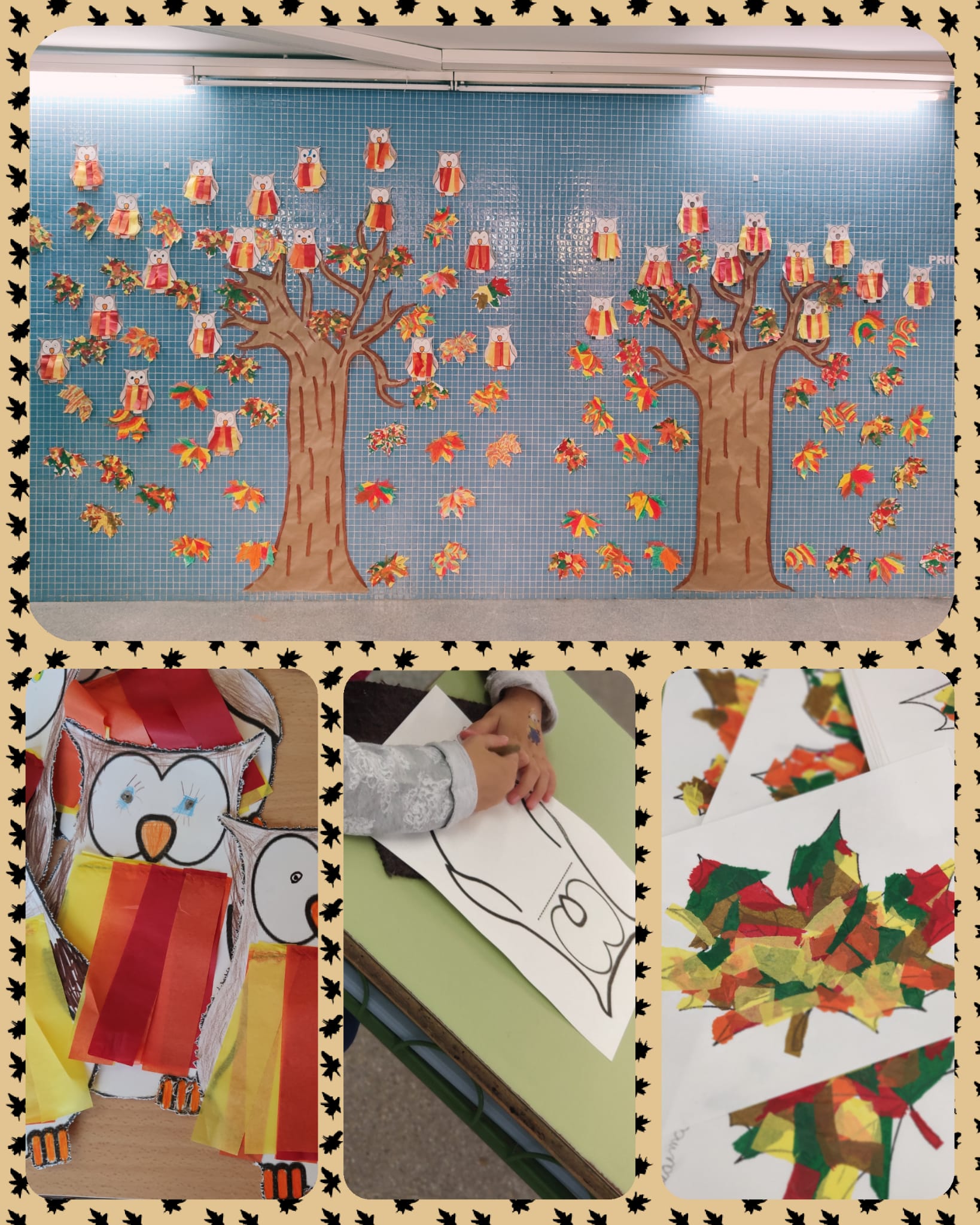 Com diu el poema, la tardor ha inundat el passadís dels nens i nenes de primer. Roig, groc i marró són els colors predominants en aquests dies. Arbres despullats, fulles arrossegades pel vent i mussols tafaners s’han instal·lat a la nostra Escola gràcies als i les artistes de primer!