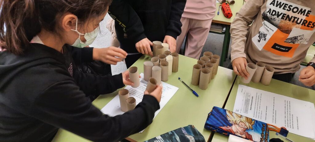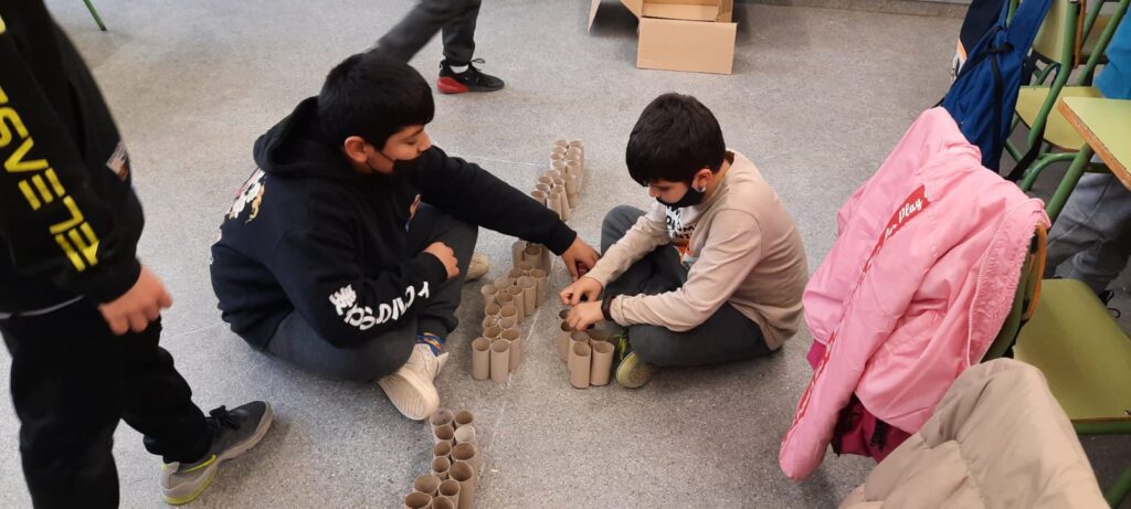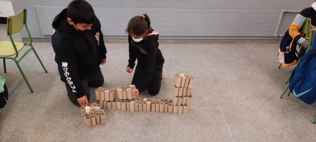 Concretament, el títol de la unitat didàctica que estem desenvolupant és “Quant mesura la casa dels Pastorets?”. En Lluquet i en Rovelló ens demanen ajuda per construir la seva casa, ja que un temporal l’ha destruït. Durant les últimes setmanes hem estat fent càlculs, plànols i maquetes, realitzant operacions i treballant el perímetre. Aquesta setmana hem dibuixat un rectangle en el que tota la classe hi capiguès. Després, amb rotllos de cartró, hem construit “maons” i hem fet la primera filera de pedres. Amb aquestes dades, tot tenint en conta la porta i les finestres, hem hagut de calcular quants rotllos de cartró necessitariem per a poder construir la casa. Necessitariem molts!