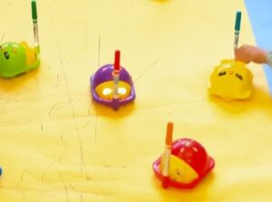 Durant les sessions de robòtica ens hem iniciat en les Bee bots. Una de les experiències de treball més divertides ha estat pintar amb aquests robots. De forma motivadora hem realitzat dibuixos lliures a partir de donar ordres a la Bee Bot. Hem utilitzat una carcassa que fa de suport a un rotulador i hem pogut seguir el recorregut que fan les Bee bots. De forma esgrescadora i motivadora hem potenciat el pensament compatucional i la creativitat.