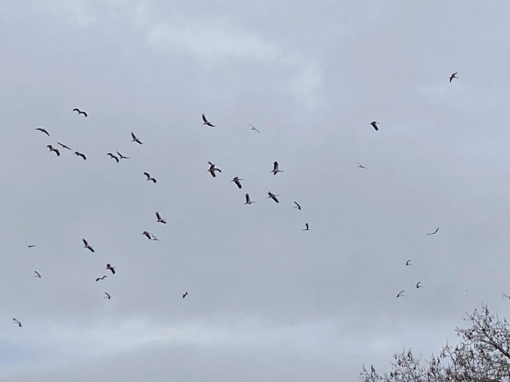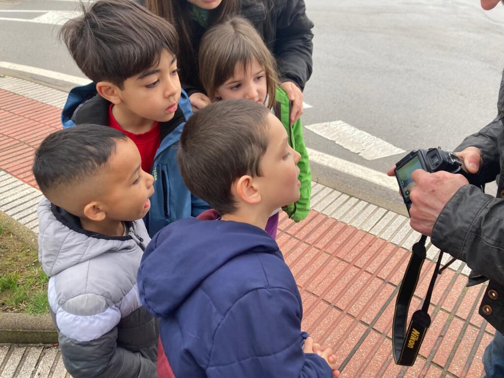 Amb gran entusiasme, els infants hem caminat fins al camp del costat de l’escola, per poder veure aquestes majestuoses aus, de plumatge blanc i negre, en el seu viatge migratori.