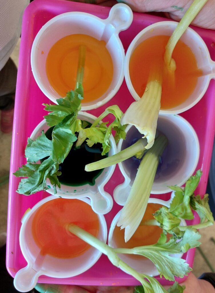 Després de tot aquest temps hem pogut observar que les fulles i les tiges s’han tornat del color del colorant i de la tinta que vam posar a l’aigua.