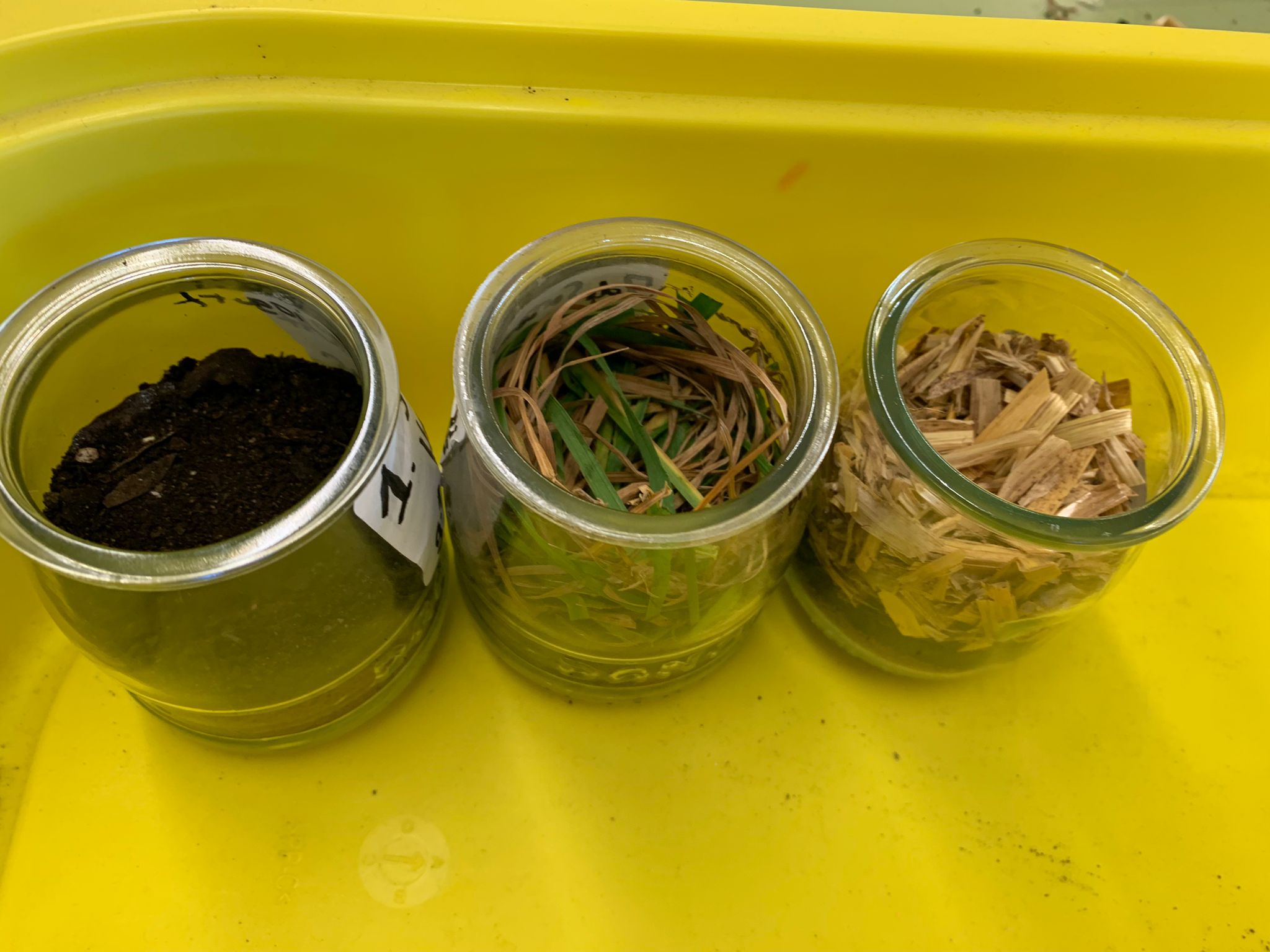 Cada recipient té la seva etiqueta amb els elements que té i el nom dels membres del grup que l’han fet.
