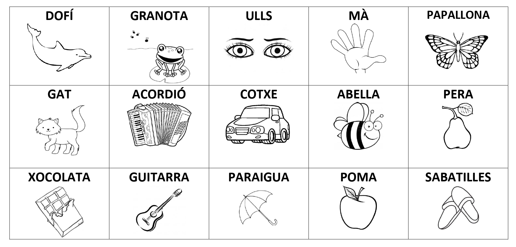 D’aquestes 23 paraules i dibuixos n’heu de triar 15 (els que vulgueu) que seran els que haureu de dibuixar o escriure la paraula al vostre taules de joc. Haureu de dibuixar una taula amb 5 columnes i 3 files i a cada casella hi haureu de fer el dibuix o escriure la paraula que més us hagi agradat. Cicant sobre la graella us la podreu descarregar en format .PDF per poder-la imprimir directament des del vostre ordinador.