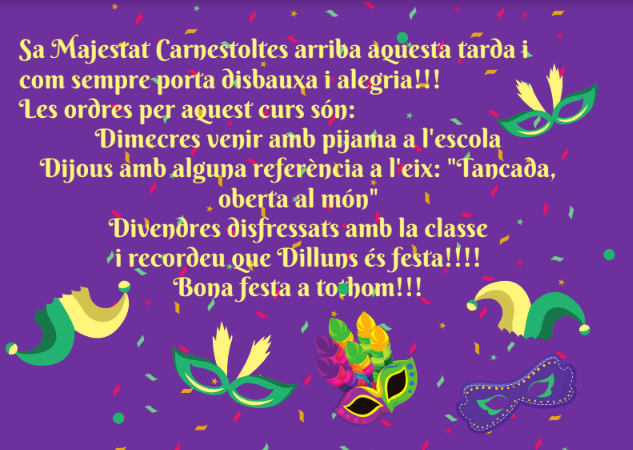 Sa Majestat el Rei Carnestoltes ens ha visitat avui, a través del Meet, per inaugurar el Carnaval i la setmana cultural i per fer-nos arribar les ordres d’aquest any.  Animeu-vos a participar de la disbauxa d’aquestes dies.