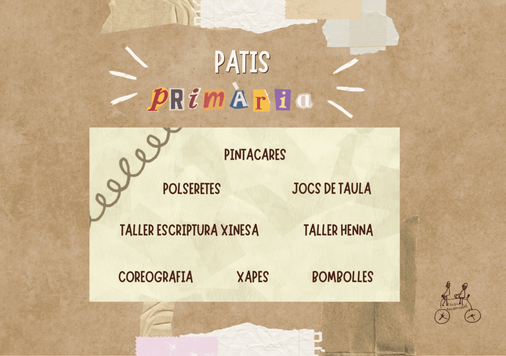 TALLERS PATIS PRIMÀRIA: Pintacares, polseretes, jocs de taula, bombolles, xapes, coreografia, taller henna, taller escriptura xinesa…