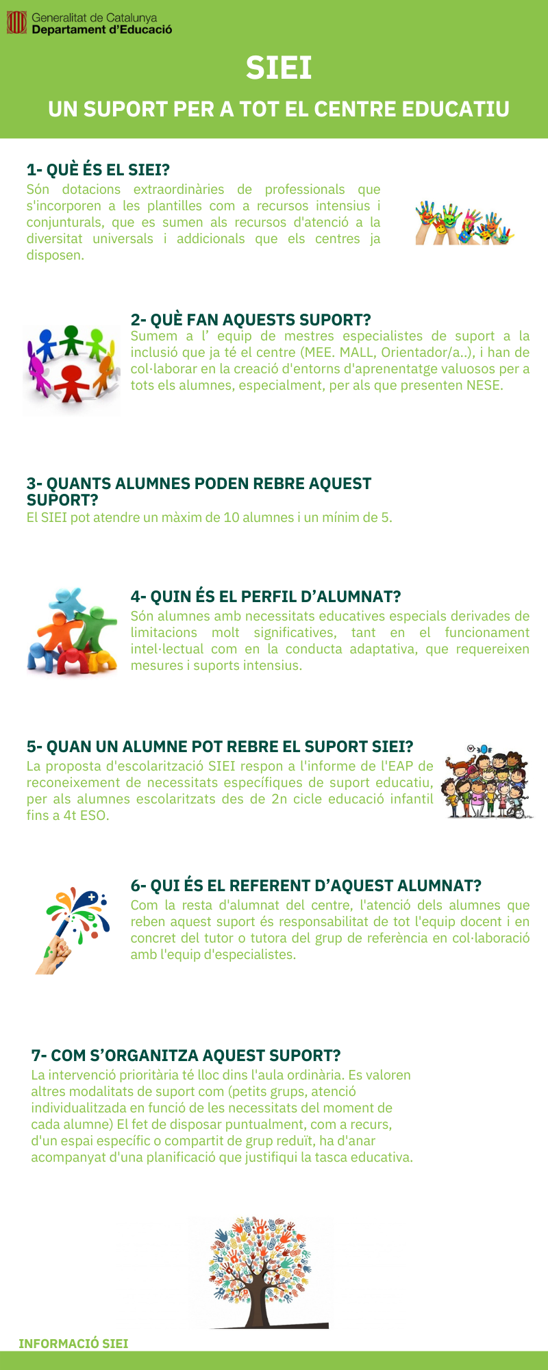 A partir d’aquest curs 2025/26. comptem amb el suport SIEI. Són dotacions extraordinàries de professionals que s’han incorporat a la plantilla de la nostra escola com a recursos intensius per atendre tant als alumnes amb necessitats educatives especials com a tots els infants que ho necessitin.