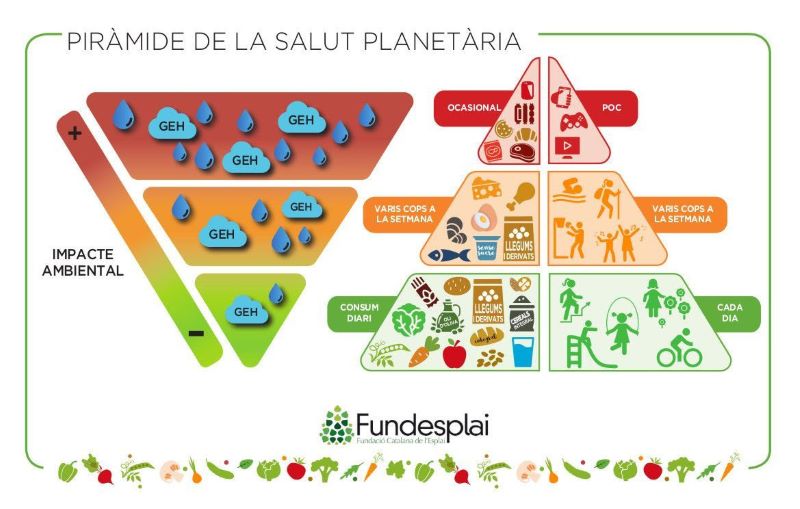 Us convidem a conèixer la nova piràmide de l’alimentació saludable i la salut planetària, en la que es reflecteix l’impacte ambiental dels aliments i també la necessitat d’exercici físic.