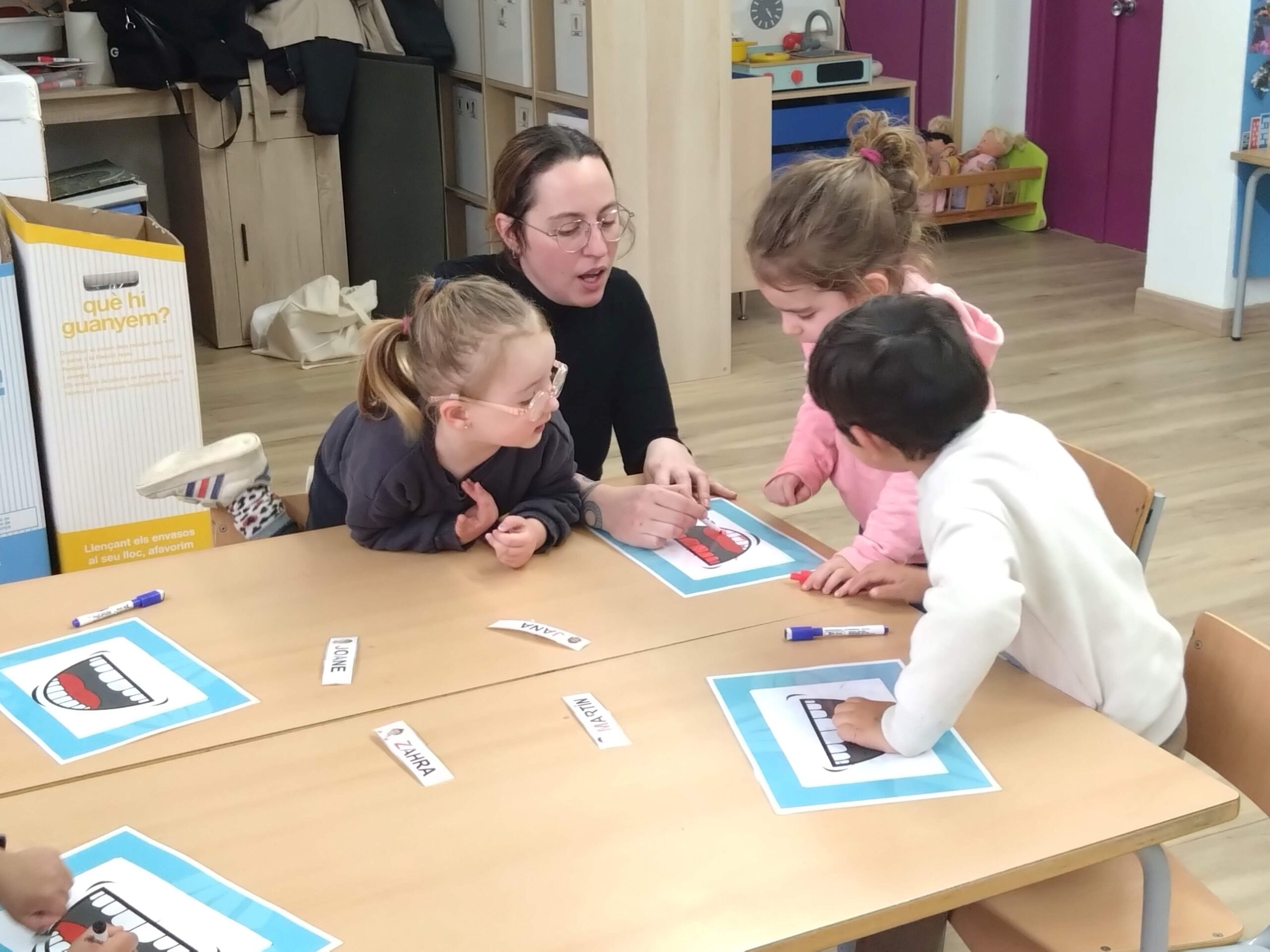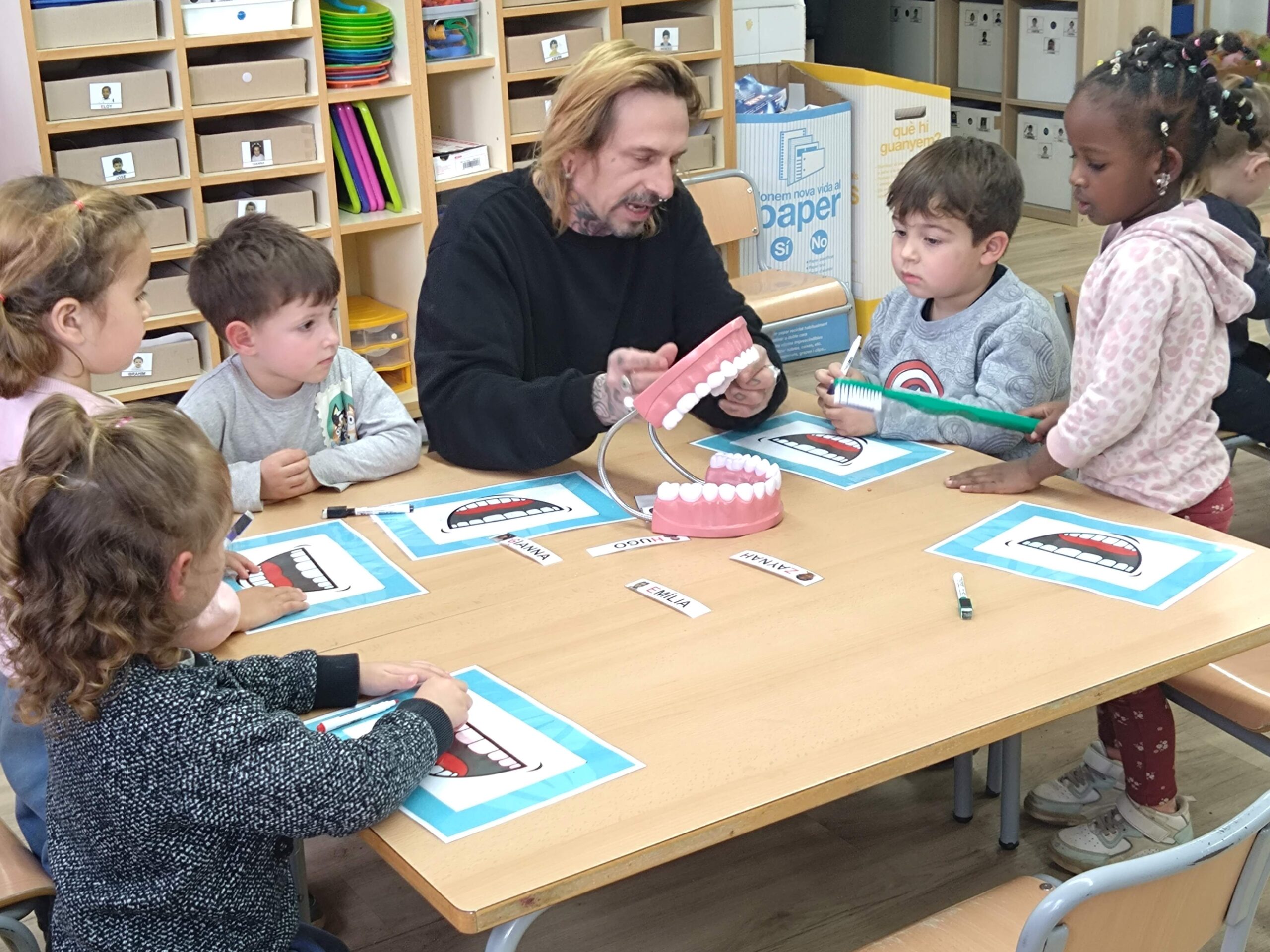 A la classe dels superherois i de les superheroïnes la Montse i en Josep, els pares de la Joane, ens ha muntat una activitat per ensenyar-nos com n’és d’important tenir les dents ben netes i raspallades. Hem parlat dels aliments que més agraden a les nostres dents i d’aquells que no ens convenen gaire.
