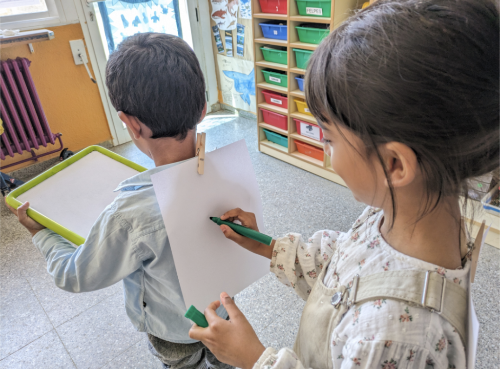La proposta, aquest cop, ha estat una activitat de dibuix on els infants, per equips, havien d’anar descobrint els dibuixos que feien els seus companys/es sense el sentit de la vista i només reproduint el que un company o companya li feia a l’esquena.