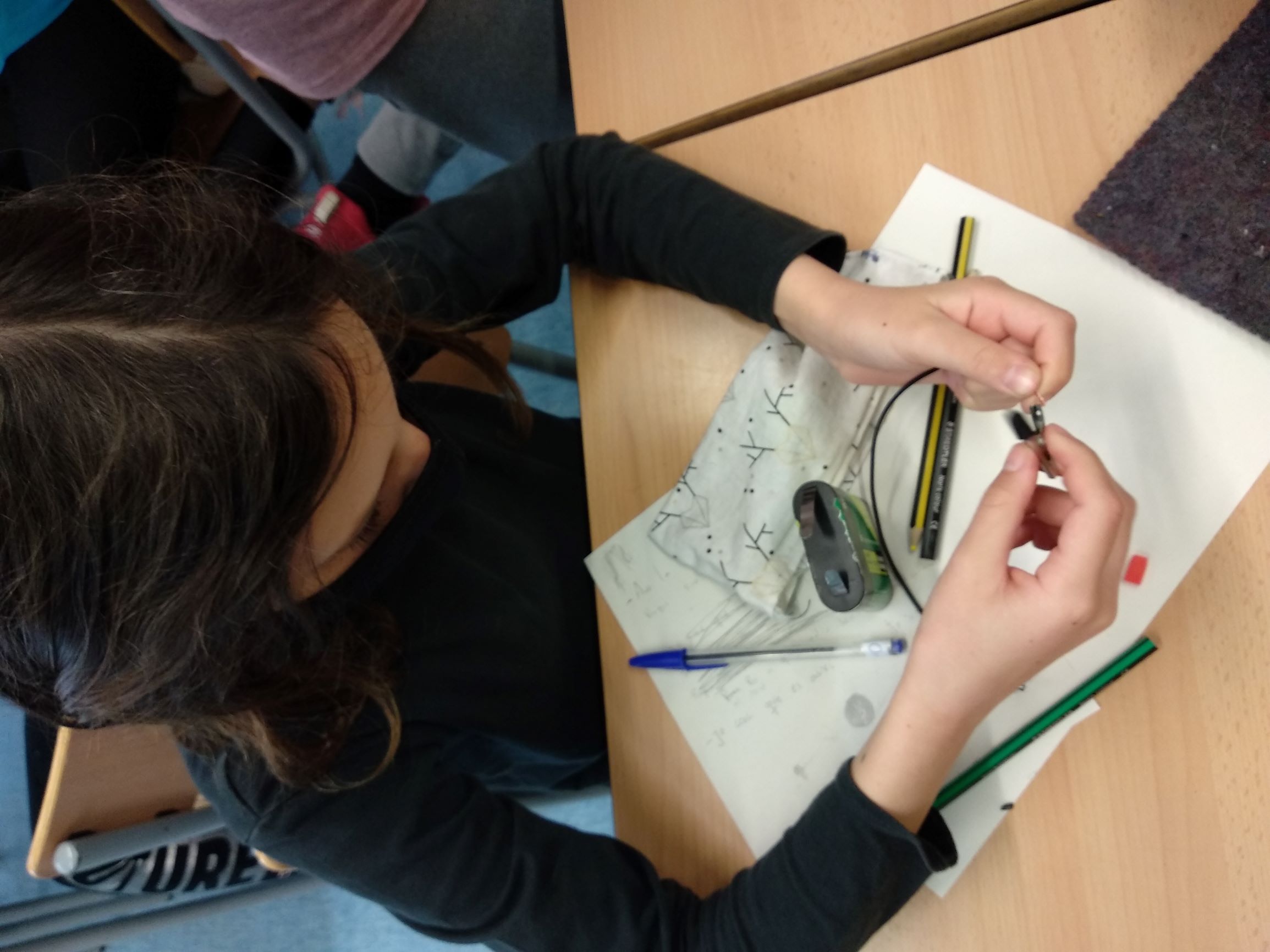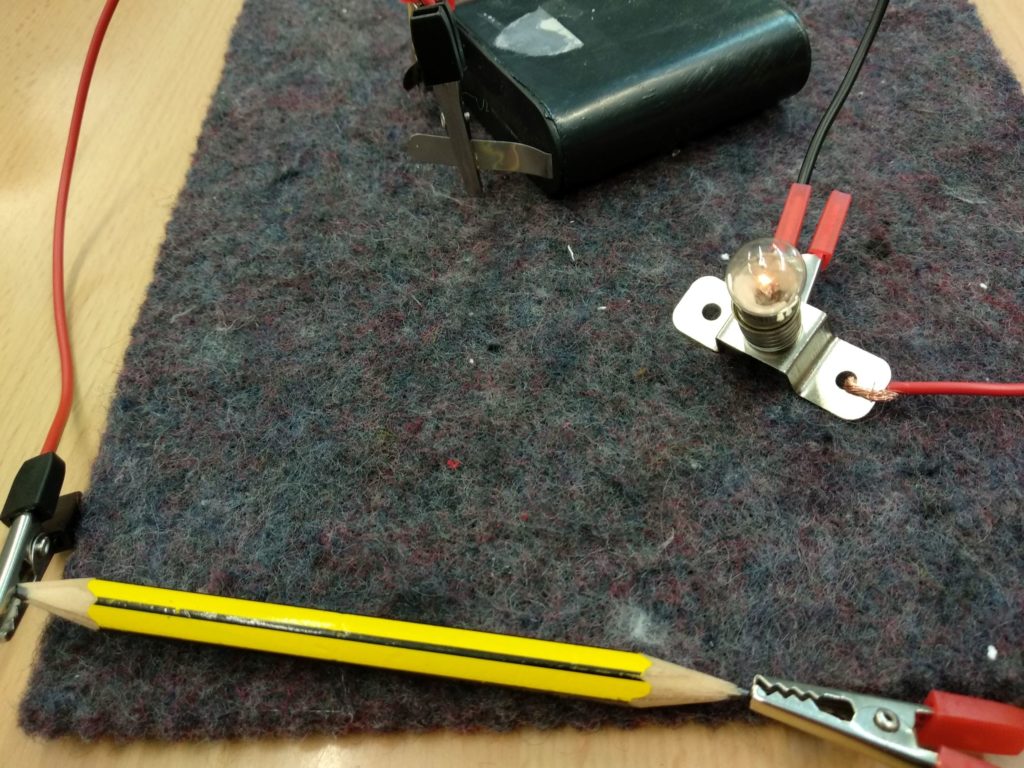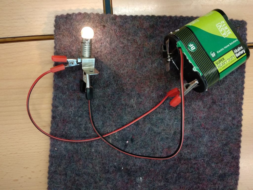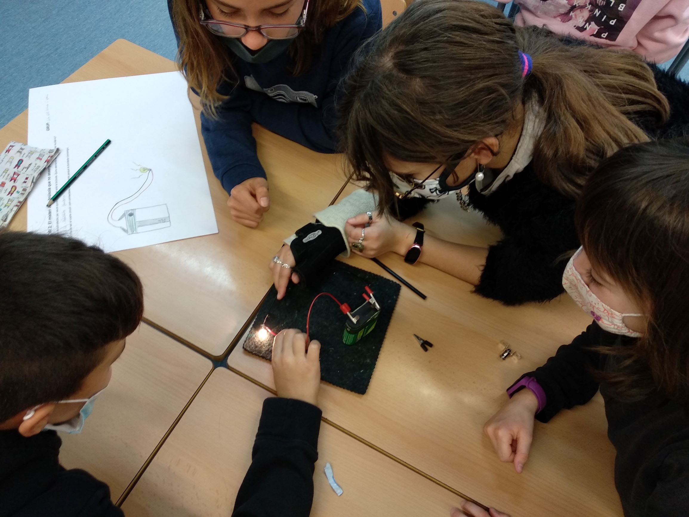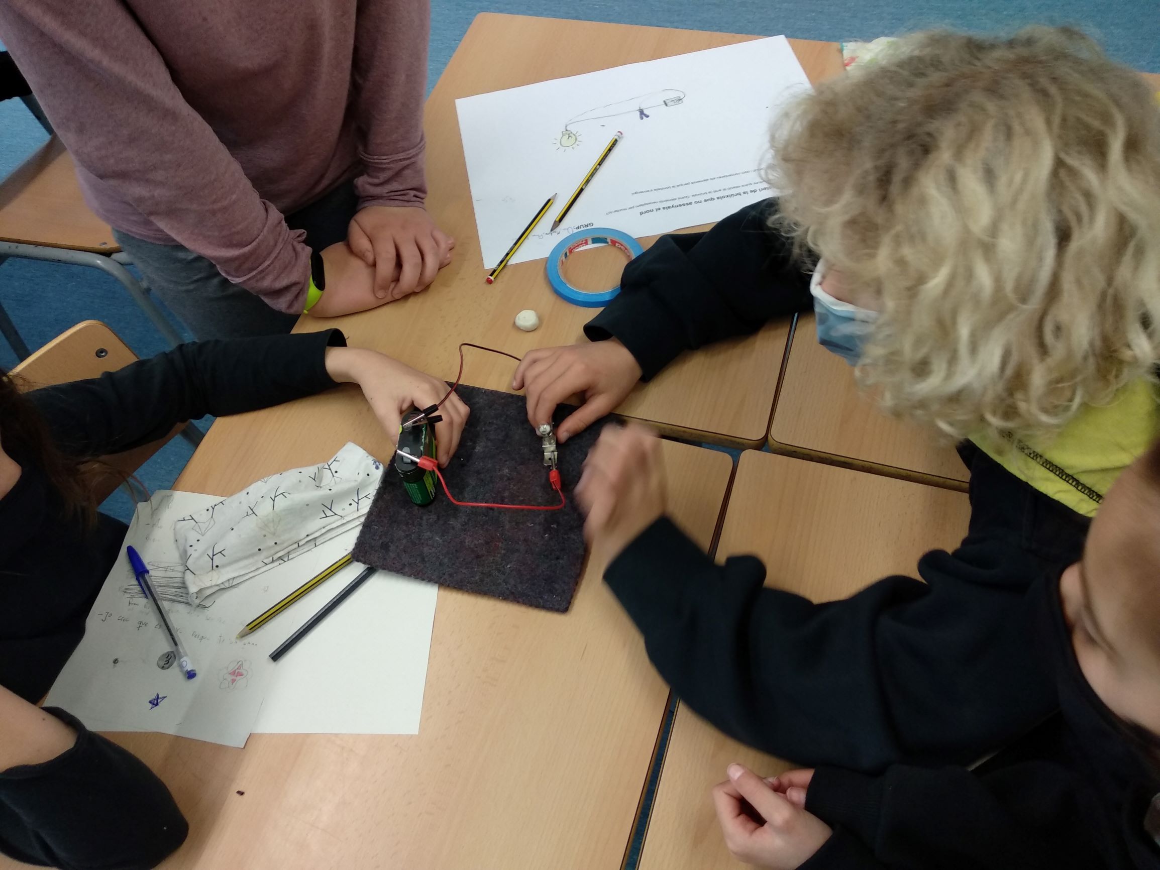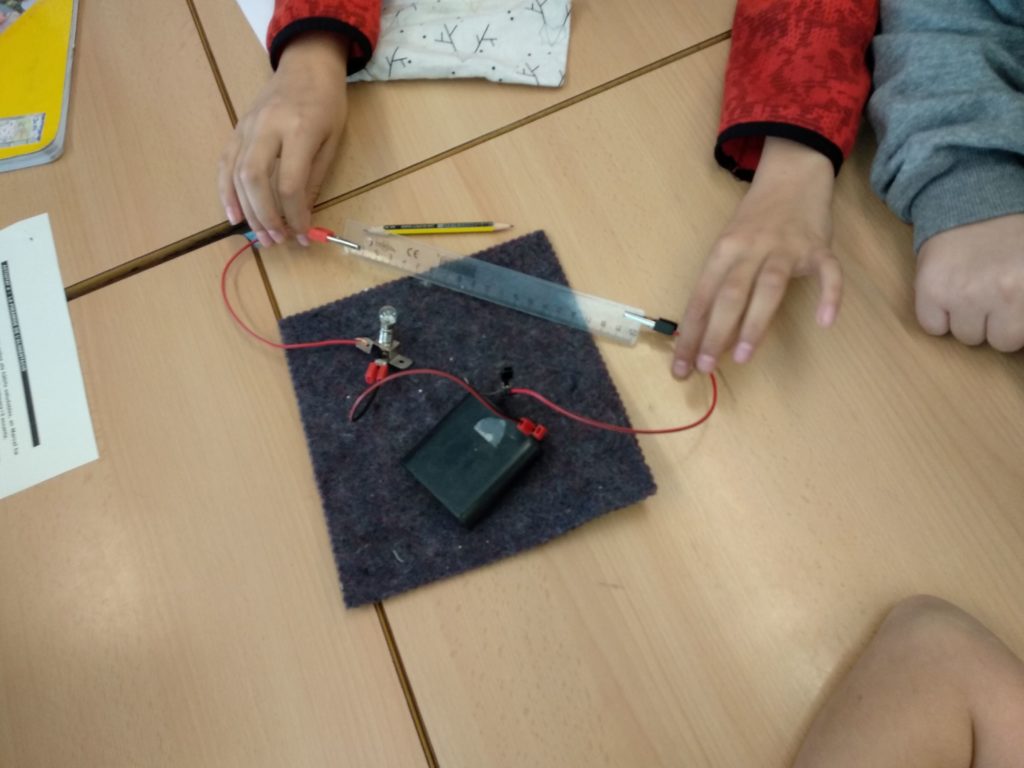 El laboratori continuava i ens vam plantejar un altre repte, fer un circuit elèctric. L’objectiu d’aquest era encendre una bombeta, per tant cada grup va començar a dissenyar el seu a un paper i va anotar els materials que necessitaria per poder superar el repte. Després amb els materials, cada grup va muntar el seu circuit per veure si funciona. Gairebé tots els grups vam fer servir el mateix material: bombeta, pila, cables i pela-cables. Al cap d’alguns intents, fent les proves amb els cables, la bombeta se’ns va il·luminar a tots els grups quan vam connectar els cables al lloc correcte.