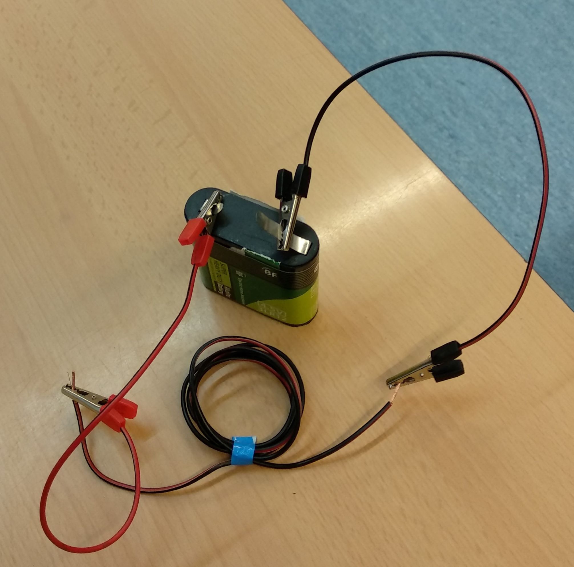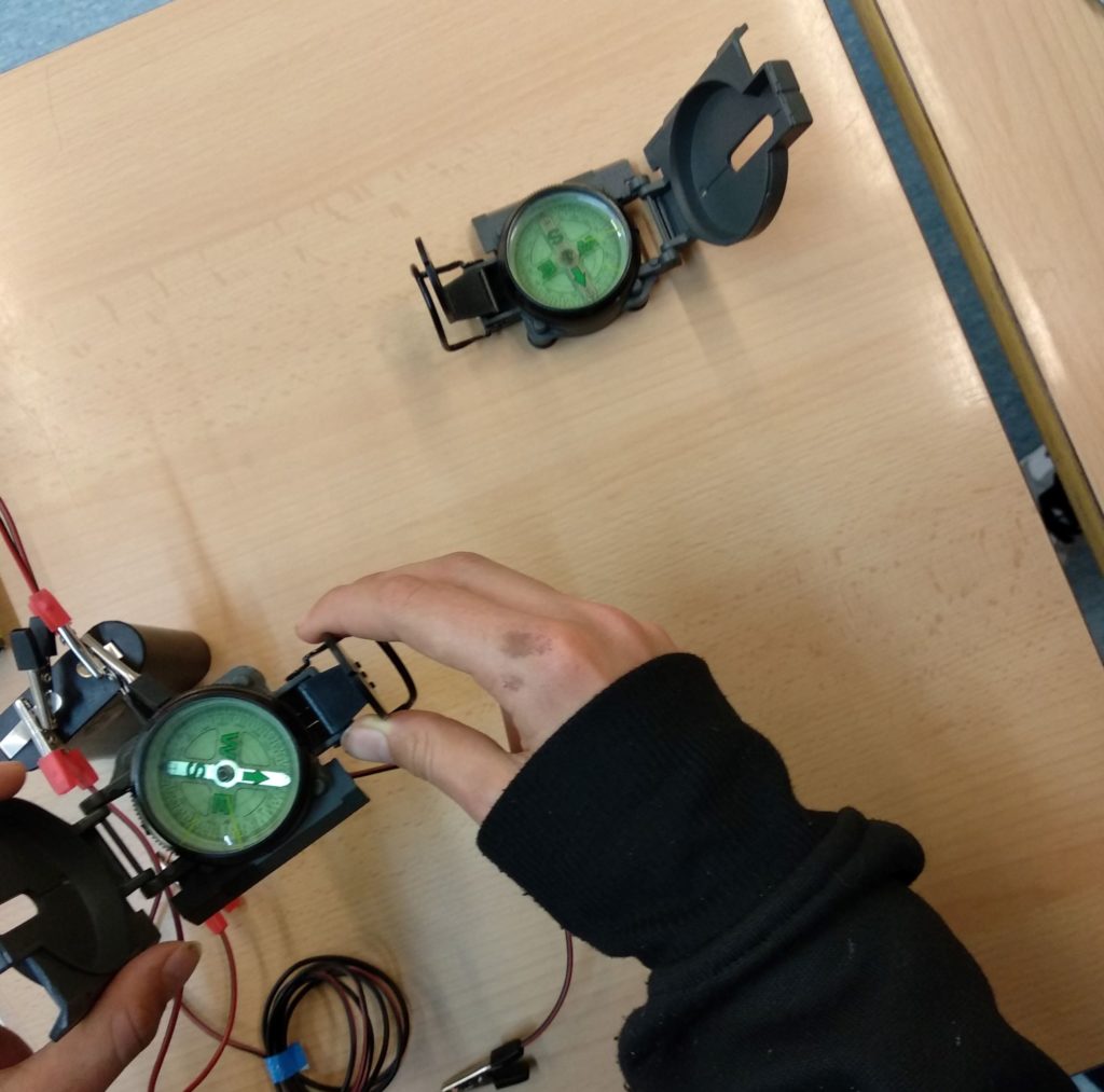 El següent pas era fer un altre circuit però aquest cop sense la bombeta. Per a aquest havíem d’enrotllar un cable d’un metre i amb una cinta ho assegurem per a que no es desfés l’embolic del cable. A continuació, a una pila, li havíem de connectar els dos extrems amb l’ajuda de dues pinces de cocodril per assegurar que no es desconnectés. Tot seguit, un a un, vam agafar la brúixola i la vam moure al voltant del circuit. Impressionant el que va succeir, quan apropàvem la brúixola al circuit, durant el instant que aquesta estava prop, l’agulla tornava a deixar d’assenyalar el nord.