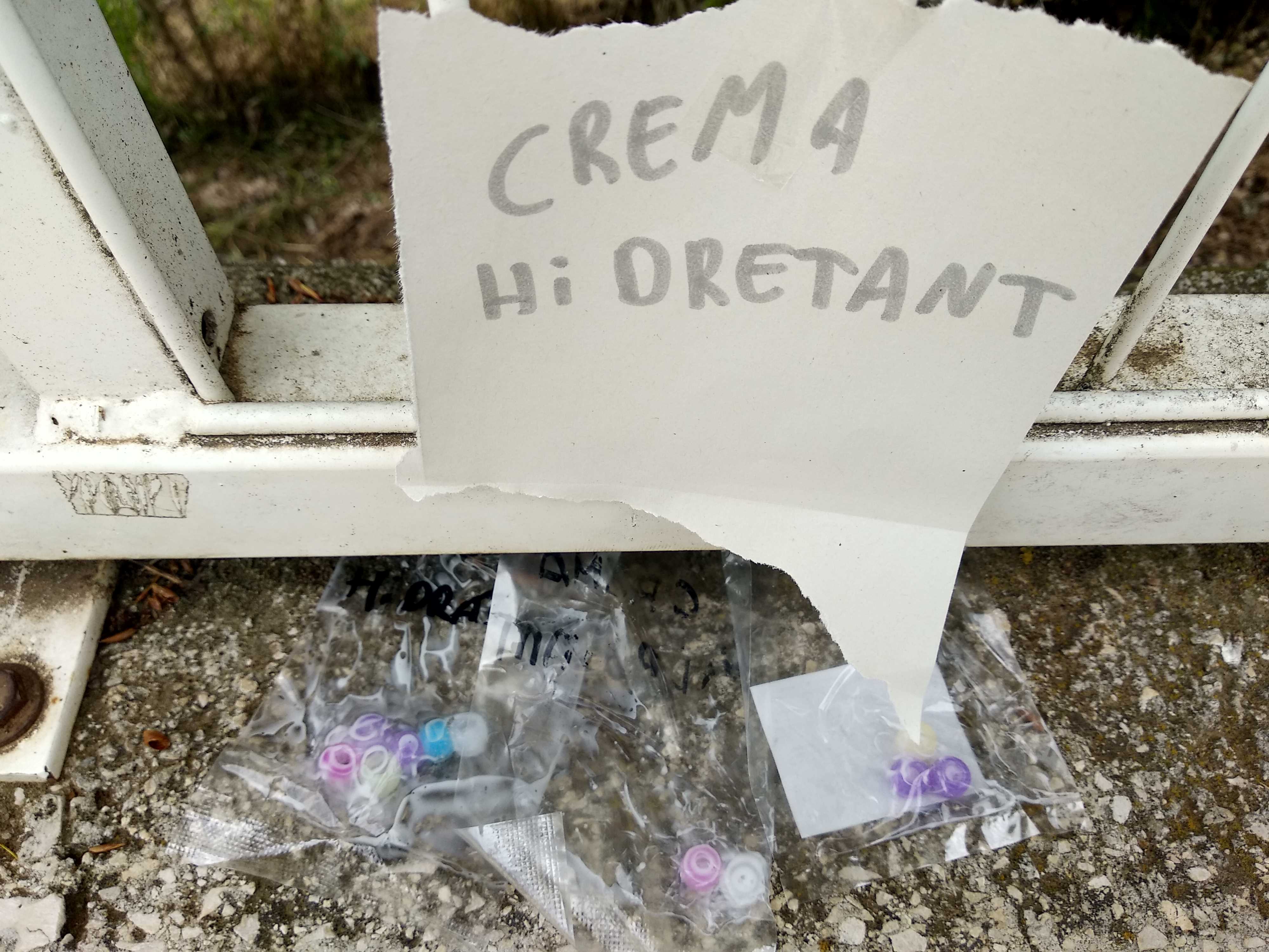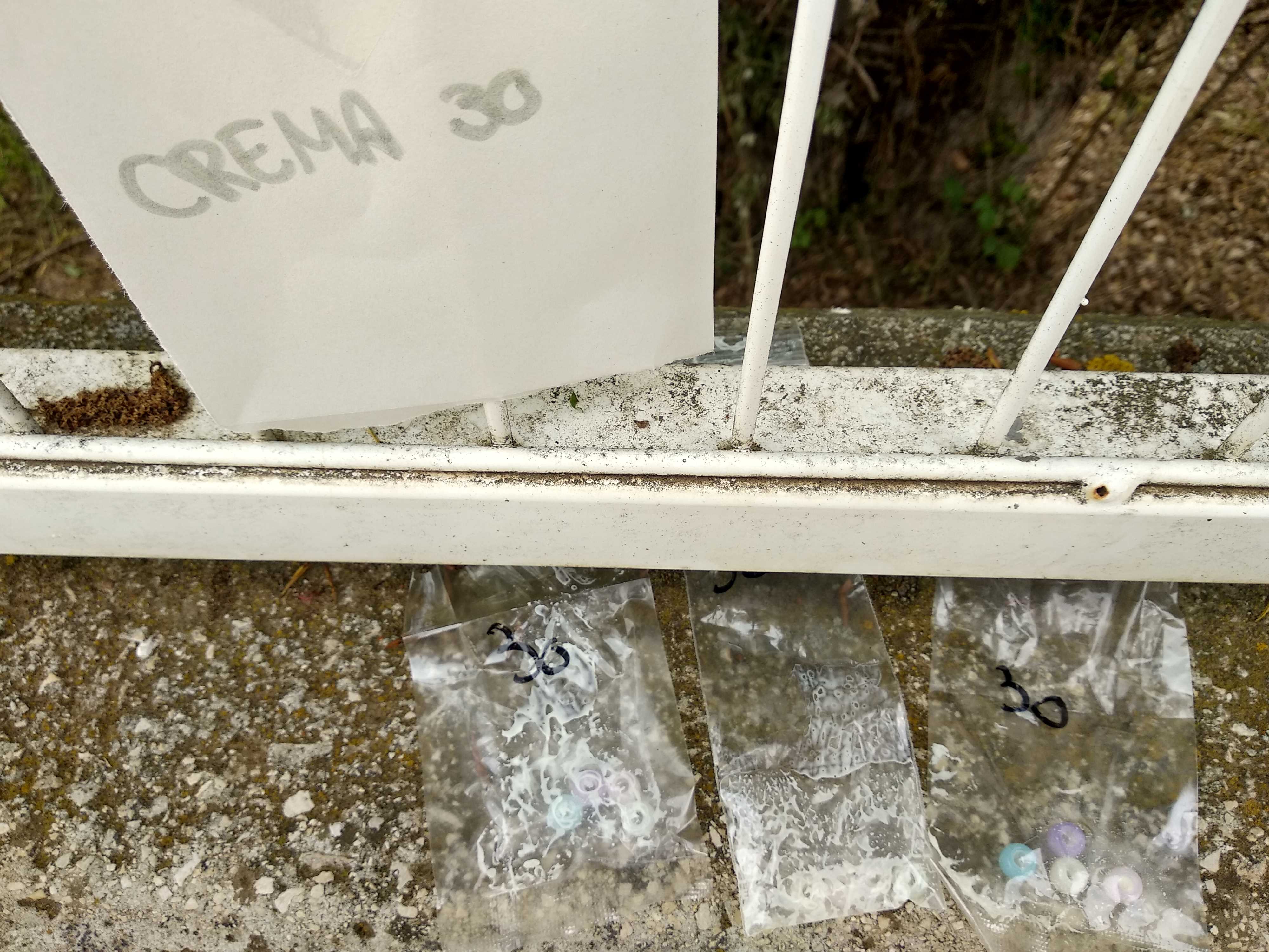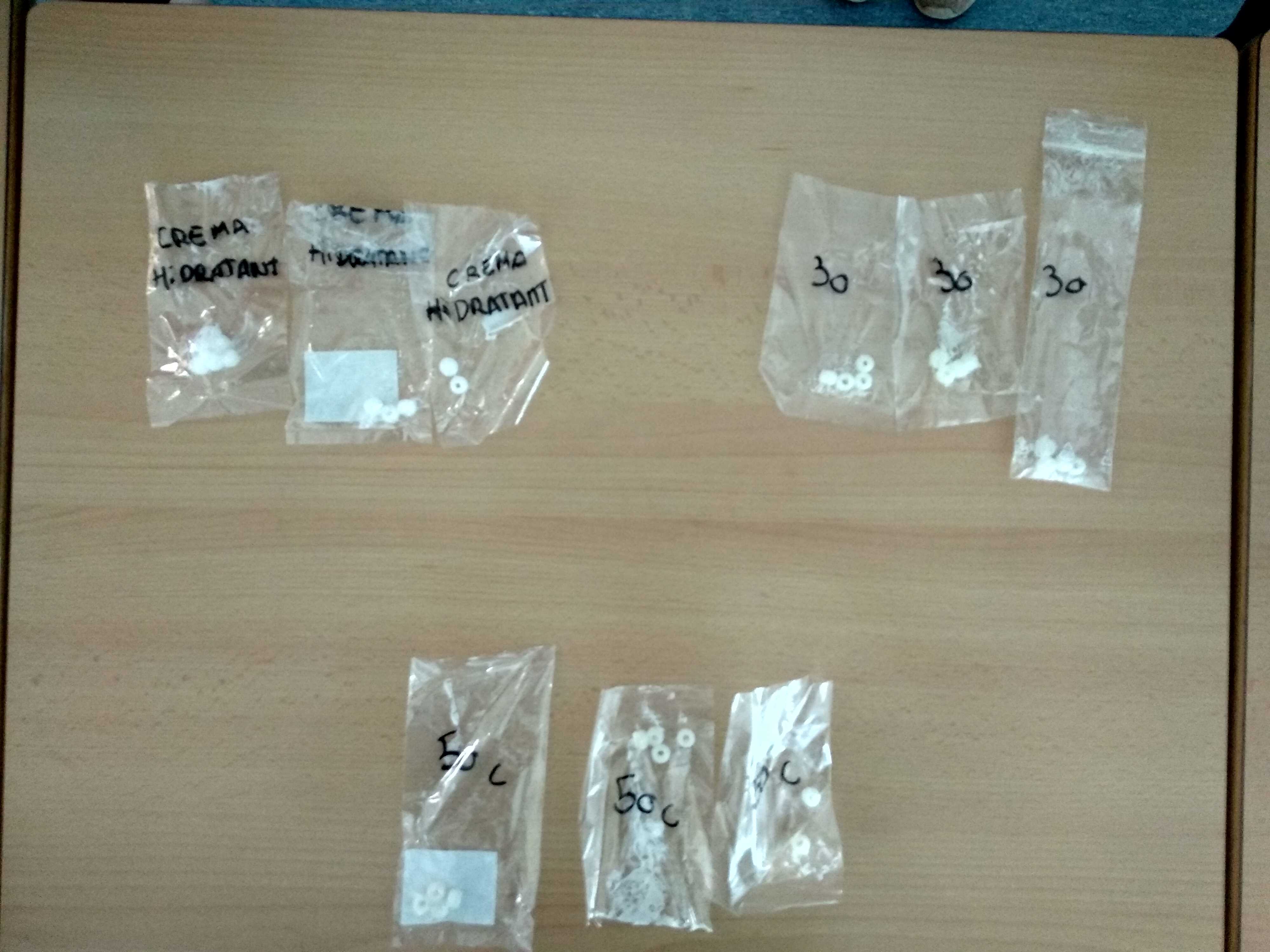 Tot i que era un dia nuvolat, vam agafar els tres tipus de crema i les vam untar en les diferents boletes. Cada grup de boletes les vam guardar separades amb diferents bosses transparents etiquetades amb el nom de la crema. Una de les cremes fotoprotectores que vam fer servir estava caducada, aquest fet ens va servir per parlar sobre la importància de tenir en compte la data de caducitat en les cremes protectores que fem servir, doncs passat aquell temps la protecció que ens ofereixen és molt menor.