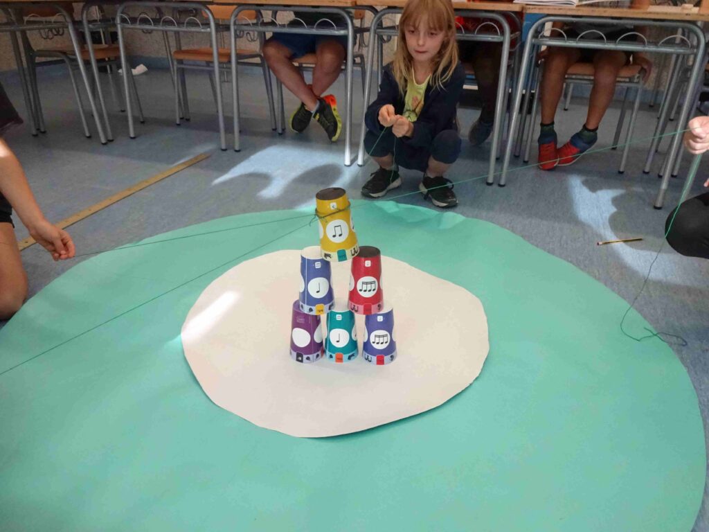 Havíem d’intentar fer una torre amb sis gots, però sense tocar-los amb cap part del cos ni entrar dins del cercle.