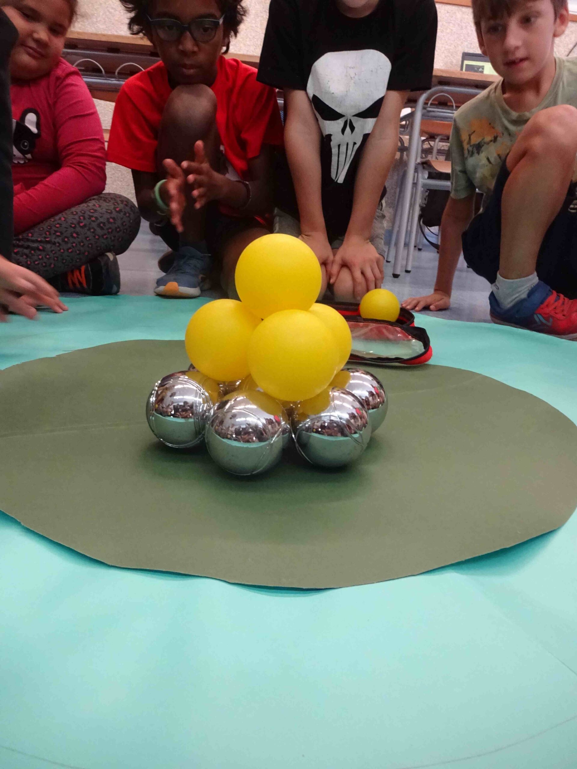 Ho vam provar amb esferes però, tot i que durant uns segons s’aguantaven, després ja no va funcionar perquè les esferes no tenen base i no es poden apilar.
