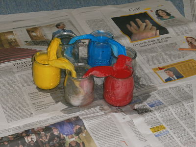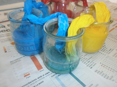 POSEM AQUESTS TRES COLORS EN UN POT CADASCUN I CONNECTEM ELS POTS AMB PAPER ABSORBENT. I OBSERVEM QUÈ PASSA.