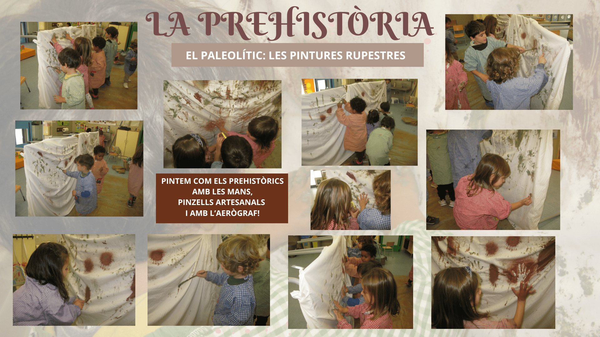 Al Paleolític feien servir l’argila per fer pintures rupestres! Pintaven les coves fent dibuixos d’animals, mans, persones… Feien servir les mans i els dits per pintar però també l’aerògraf i pinzell artesanals. Vam anar al bosc a buscar material per poder crear diferents pinzells i un aerògraf i vam fer un taller on vam estar pintant com autèntics prehistòrics!