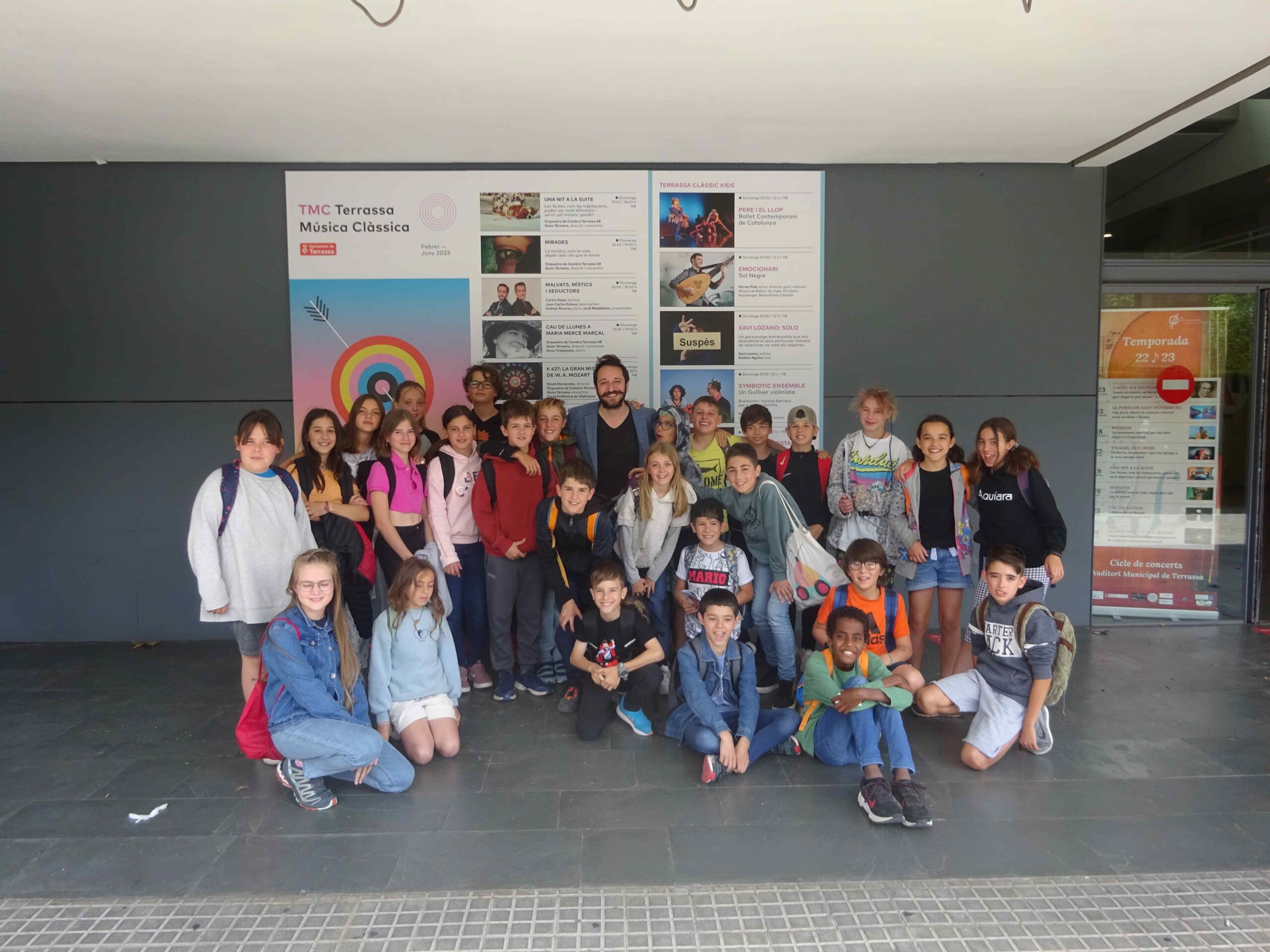 En alguns moments vam participar de valent cantant algunes de les cançons i simulant un concert dels anys 60. A la classe, prèviament, havíem escoltat i treballat una mica algunes de les cançons del concert i també parlat sobre aquesta banda mítica dels anys 60-70 que van deixar petjada al món musical fins a l’actualitat. Vam tenir la sort de poder fer-nos una fotografia amb el Litus, que posa la veu a l’espectacle i també la guitarra acústica.