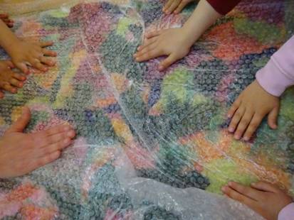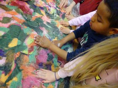 Després de fer el taller de feltre i de crear el nostre mosaic, vam reunir-nos amb Petits 1 i els Minis i vam decidir entre tots fer una creació conjunta. El procés va ser el mateix ajuntant el feltre amb aigua calenta i manipulant-lo per fer que les fibres s’ajuntin, després es va enrotllar per treure l’aigua i es va deixar assecar. Va ser una activitat conjunta molt divertida i junts van crear la manta.