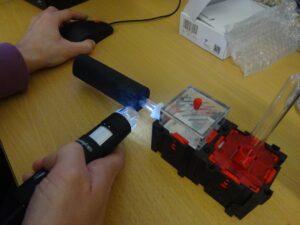 L’altre dia vam agafar la lupa binocular i les vam mirar, i també fer fotos. Les fotos no es veuen gaire bé, però sí que hem pogut comprovar que a la proveta hi ha ous, larves i pupes. Com que es posen nervioses si veuen llum, ha sigut una estona curta; que no les volem molestar.