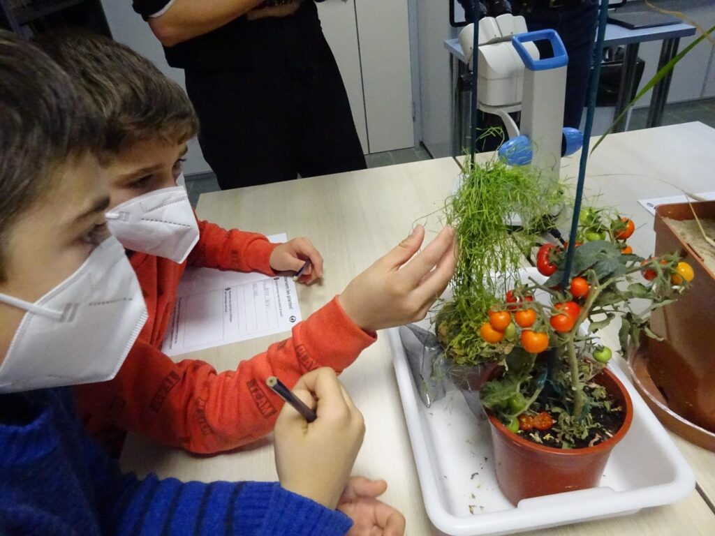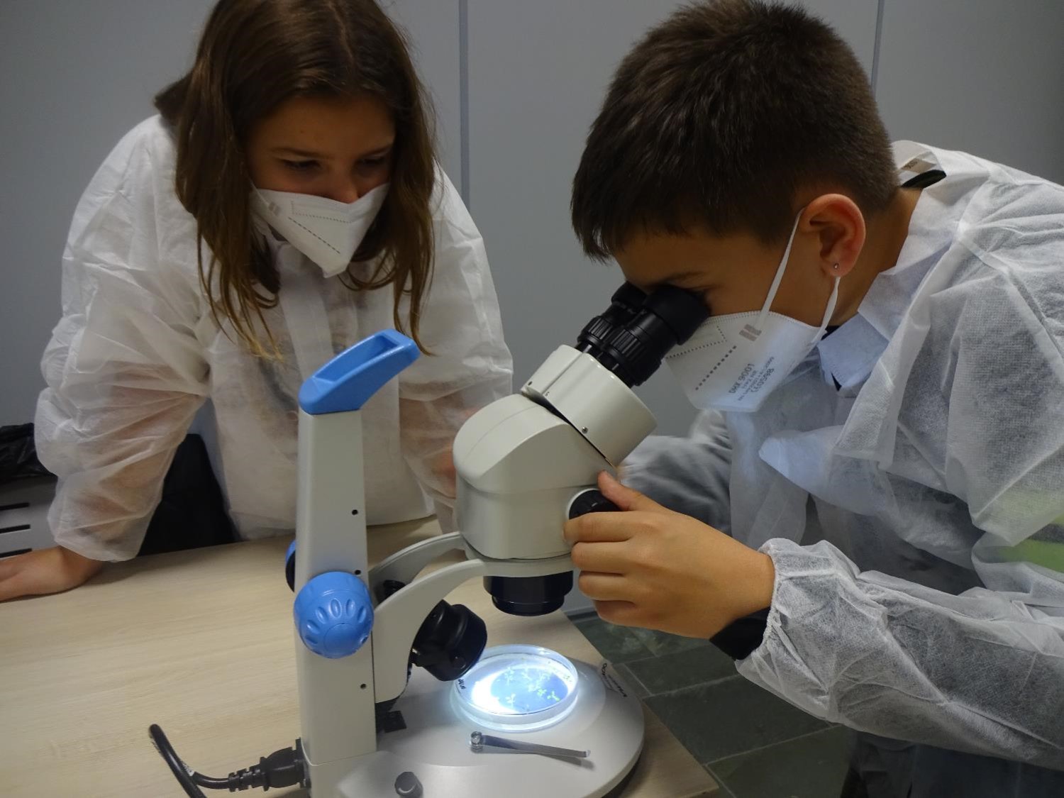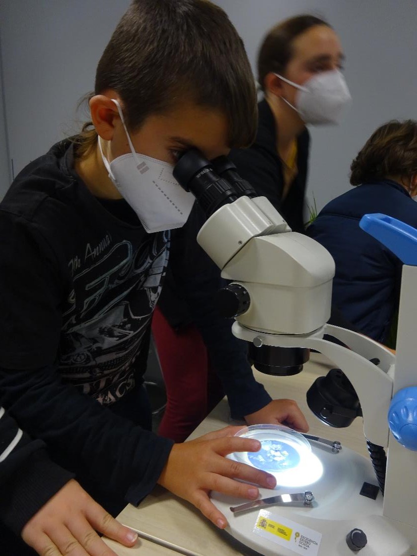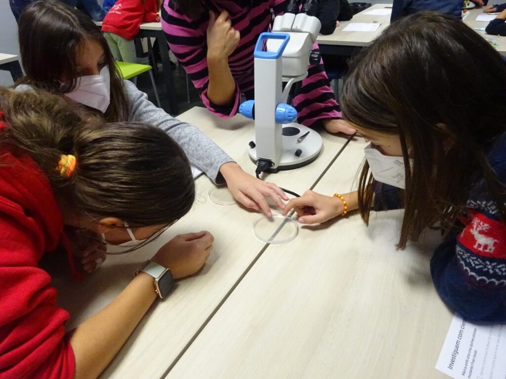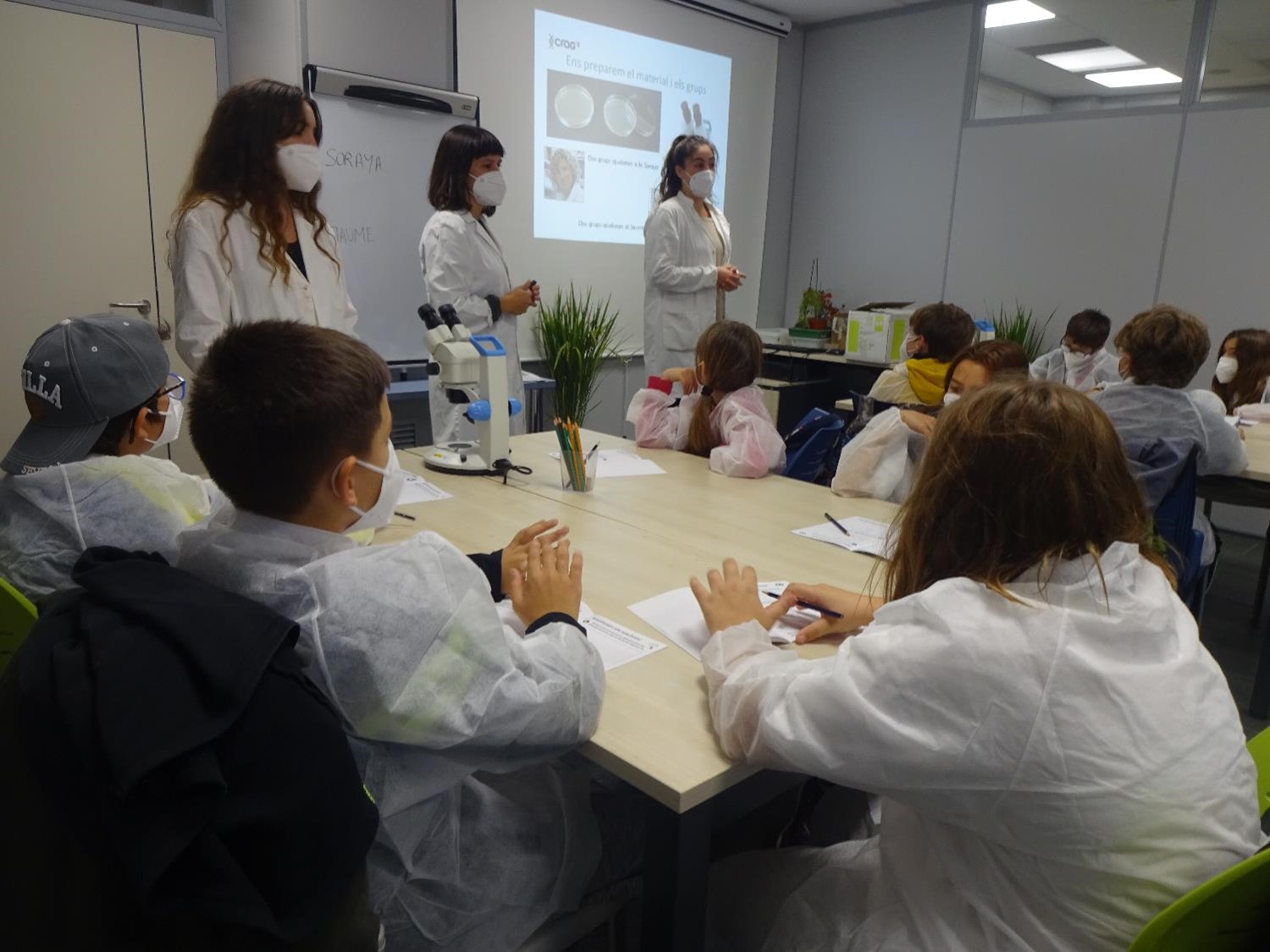 Dos dels investigadors d’aquest centre, ens demanen ajuda virtualment per diferenciar les plantes mutants en un medi prèviament preparat en una placa de petri. Així doncs, els diferents grups ens vam convertir en científics per una estona (vestits amb bata blanca) i vam començar a observar a través de la lupa binocular aquestes mostres que ens havien donat per tal d’ajudar als investigadors a diferenciar-les. Tots els equips, gràcies al treball en grup, van ser capaços d’observar les diferències entre les plantes mutants i les que no ho eren.