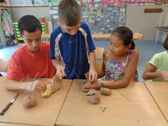 Com cada any, comencem el curs amb un nou repte. Enguany el repte ha estat intentar encendre una bombeta amb una patata o una llimona. Vam fer grups de 4 i ens vam repartir el material: patates, monedes de coure, pals de zinc, bombetes, portabombetes, cable de coure i llimones.