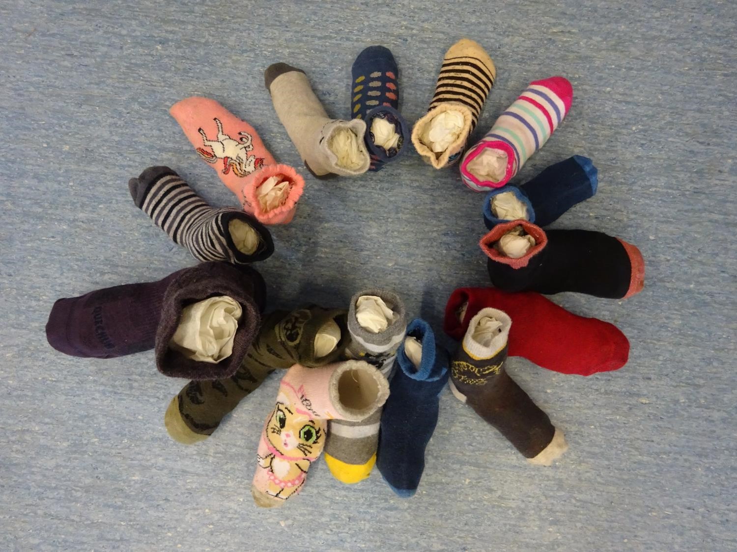 També hem farcit els nostres mitjons, i hem imaginat que feien rotllana. Potser parlaven de coses importants de mitjons, d’experiments, de flors, de poesia o de formatge, no ho sabem.