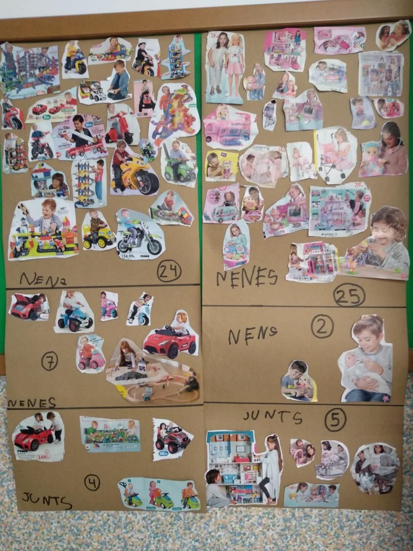 Estem mirant catàlegs de joguines aquests dies. Ens fixem si surten nenes o nens, o si surten junts, i mirem si juguen amb les joguines que surten als catàlegs.