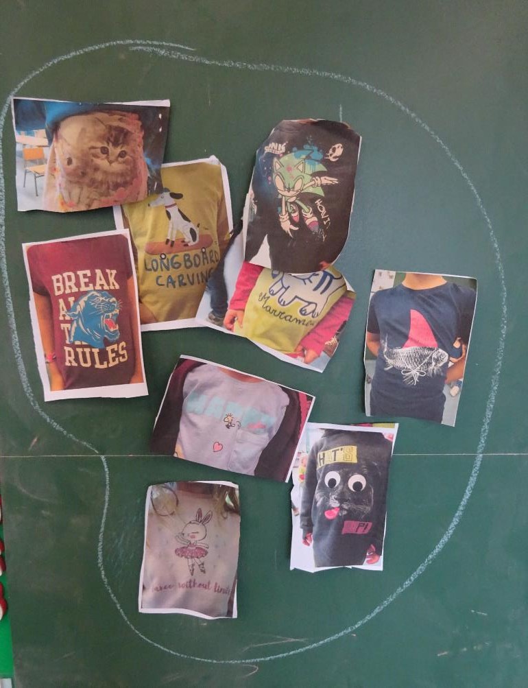 Estem fent moltes fotos de la roba; cada vegada que veiem que tenen un dibuix o lletres, fem una foto. Després, les hem retallat i les hem enganxat a la pissarra. Hem pensat com les podem classificar, i hem fet grups per colors i per dibuixos. Hi ha moltes samarretes de color negre i també de color rosa.