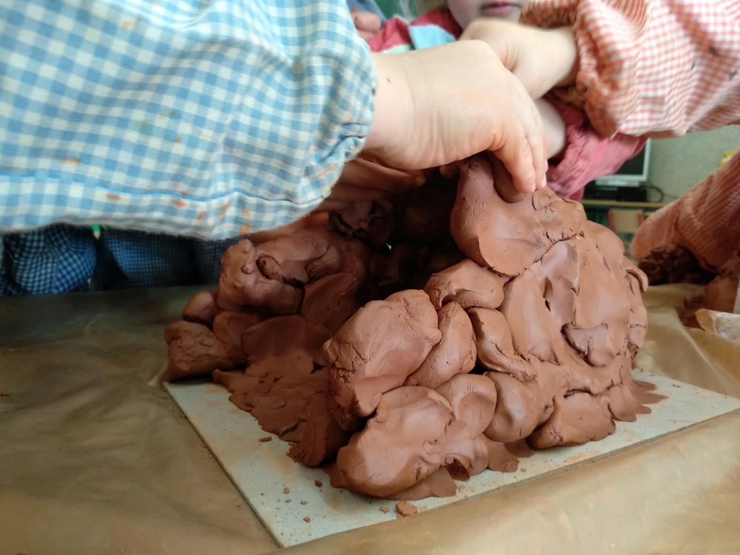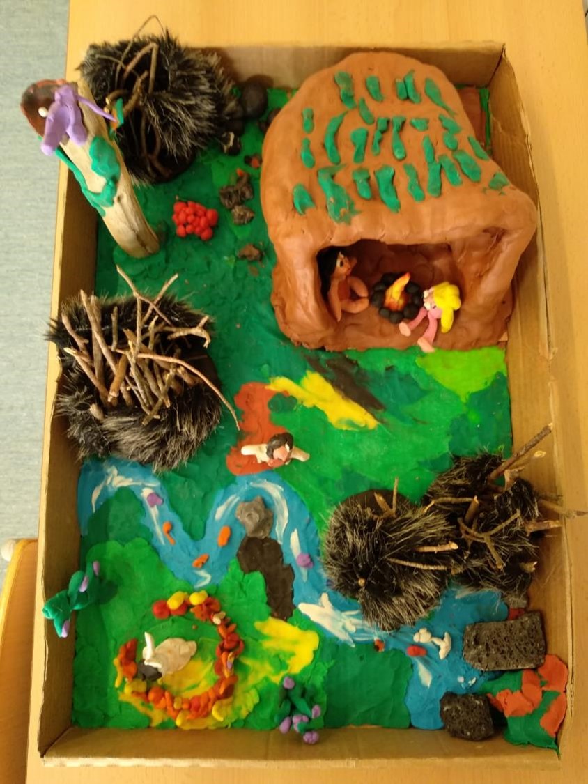 Hem fet una maqueta de fang i plastilina, ja l’hem acabat. Explica que estem fent un projecte sobre la prehistòria, del que menjaven abans.