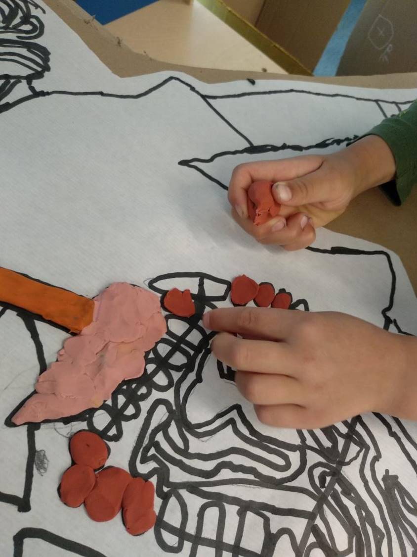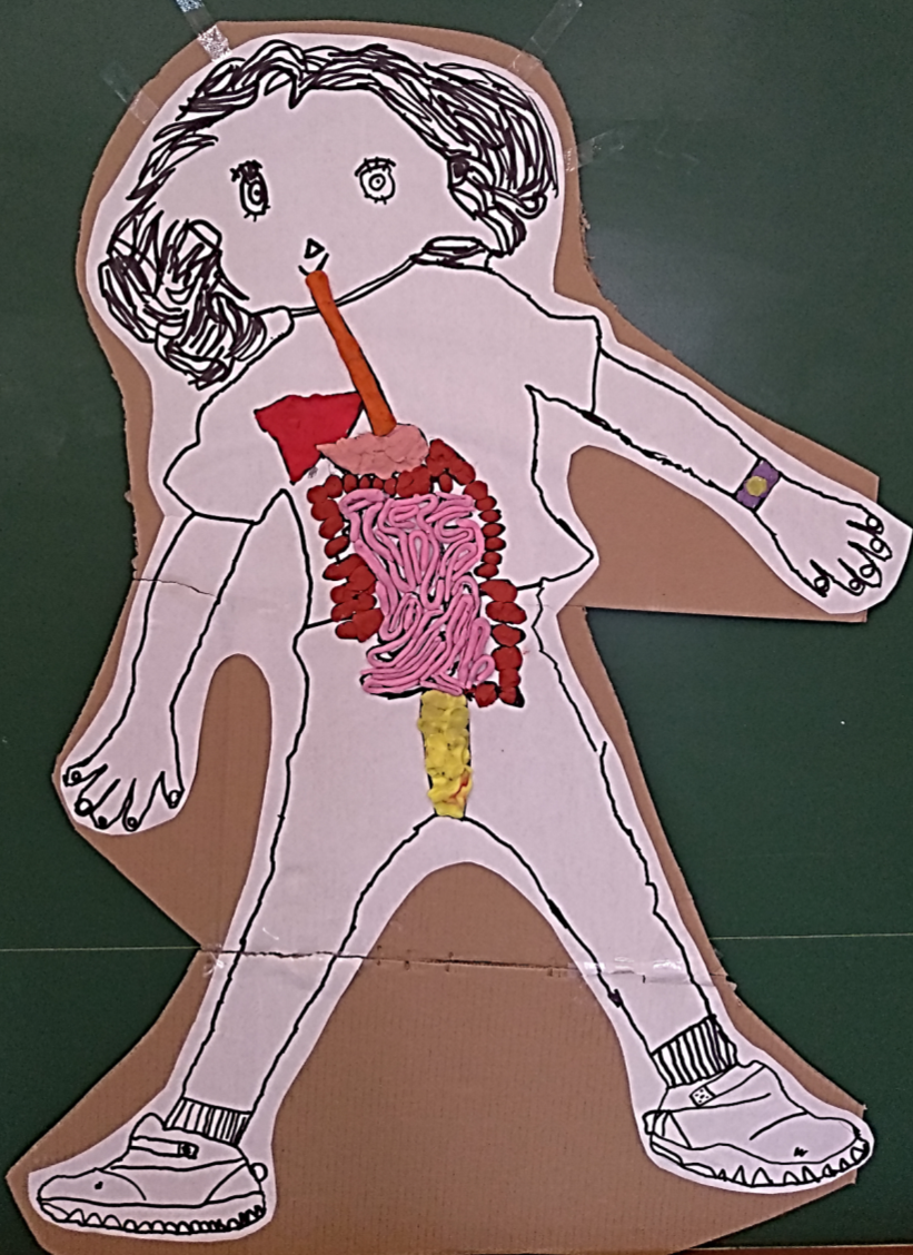 Hem fet una maqueta del cos humà. Una maqueta és una cosa que explica com és en realitat. La nostra és el cos d’una persona, però per dins, no per fora. Perquè si et mires la panxa, per exemple, no et veus l’intestí, que la pell ho tapa.