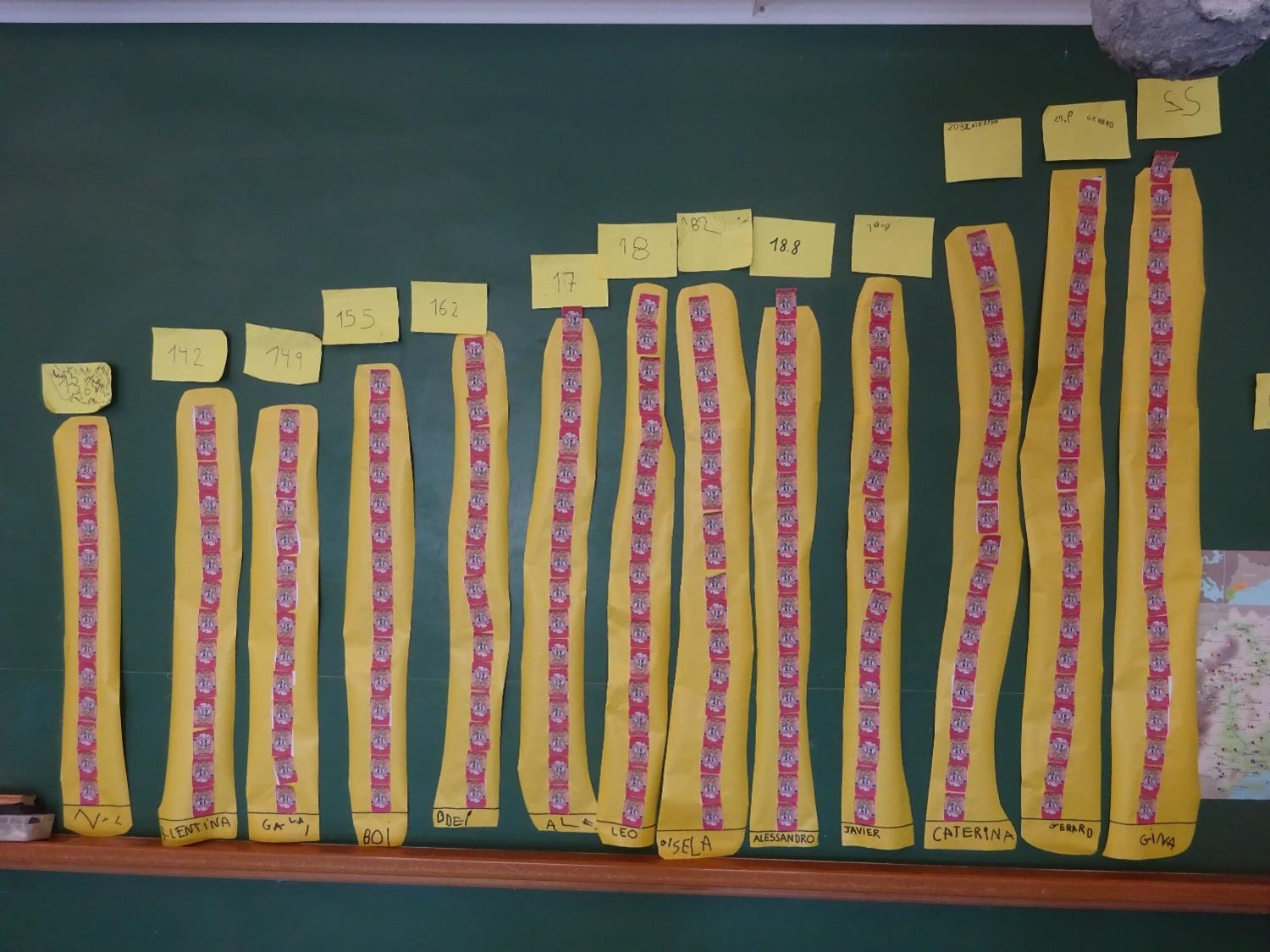 També estem preparant un mural, que es diu “mural de pesos de les persones”. Vam retallar moltes fotos d’un paquet de cigrons i les hem anat enganxant en fileres, segons el que pesa cadascú. Ens ha quedat un mural bastant gran, tan gran que no tenim espai per fer dibuixos a la pissarra. La línia és més baixeta si peses poc, i si peses més és més alta.