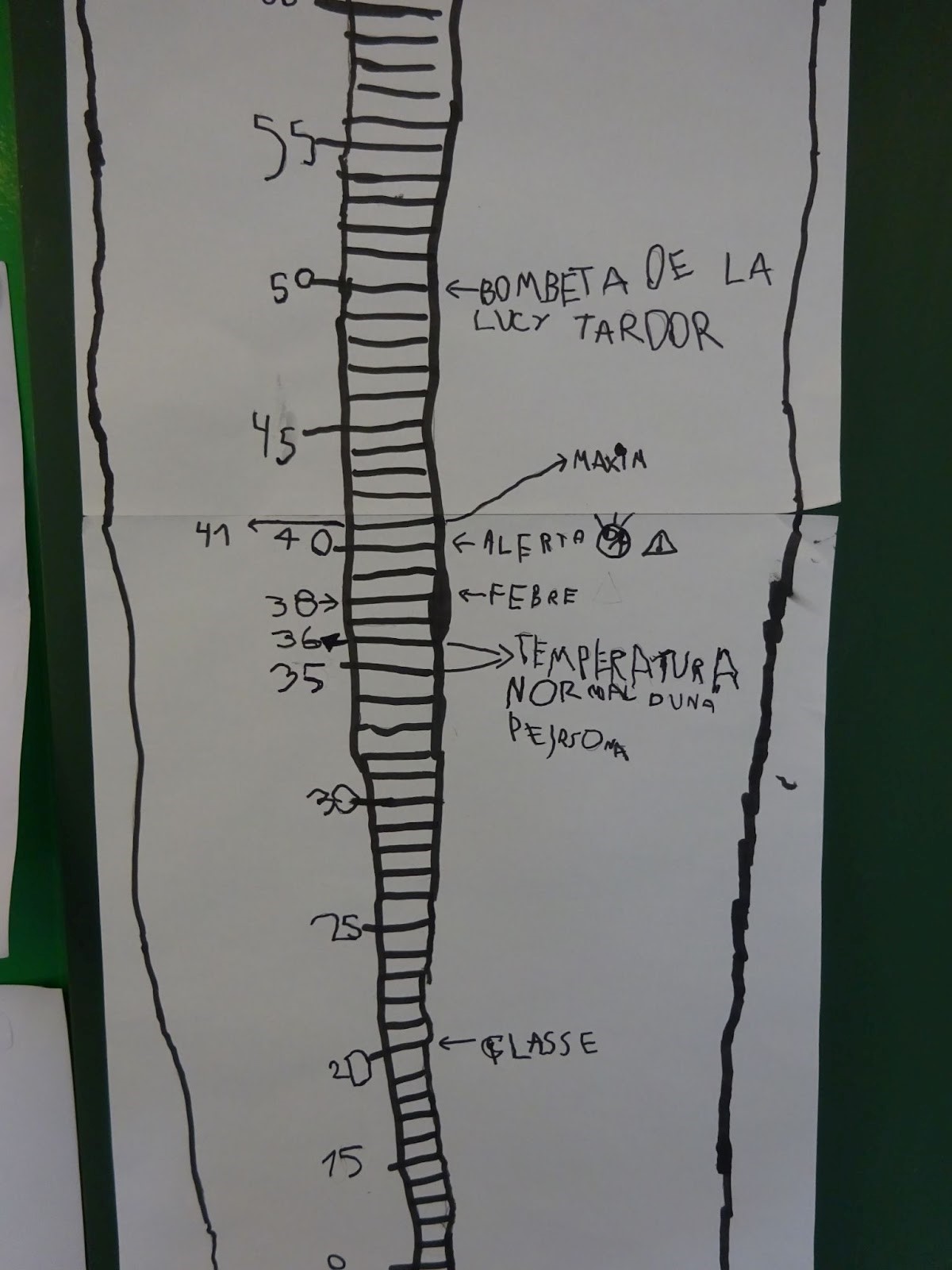 Estem fent un termòmetre gegant, ens està quedant força gran, la veritat. Això ho fem perquè hi apuntem totes les temperatures que són importants i que tenen a veure amb els projectes que estem fent. De moment hem apuntat la temperatura del cos humà per dins i la temperatura de la febre, que és 38. Hem vist que a la classe fa 22 graus i que a fora el porxo fa 6 graus.