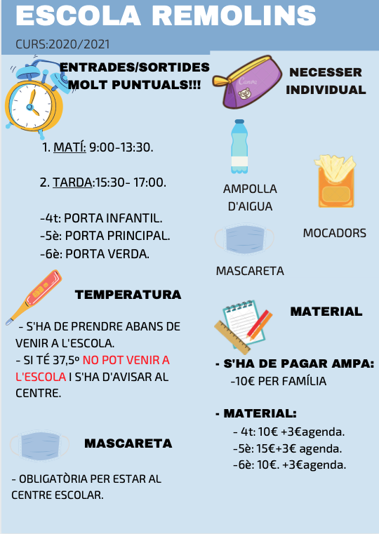 Benvolgudes famílies comencem un nou curs amb il·lusió i ganes, un curs difícil però que, entre tots, el farem el més portador possible. Aquí teniu unes directrius bàsiques explicant els horaris i el que els xiquets i xiquetes han de portar. Gràcies i bon curs 2020-2021!!!