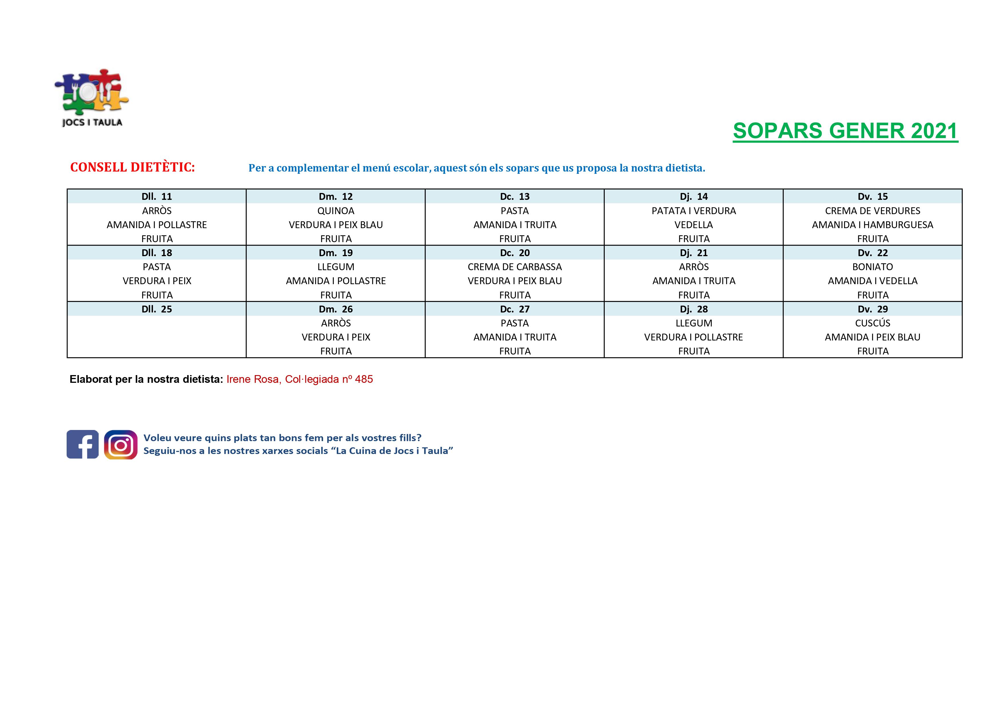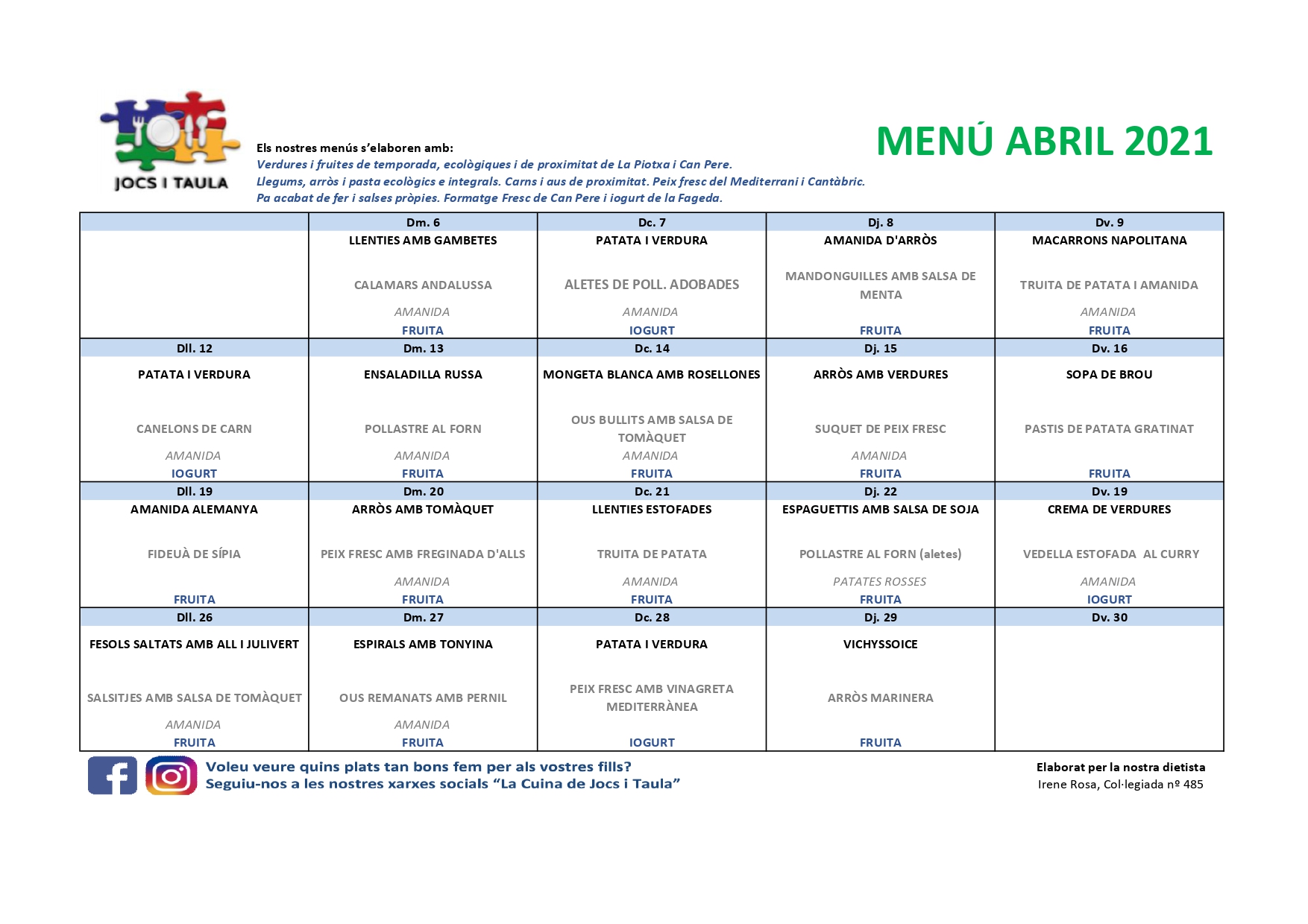 us recordem que podeu seguir-nos a les xarxes socials per veure els menús dels vostres fills i filles i totes les activitats que realitzem durant l’espai menjador.