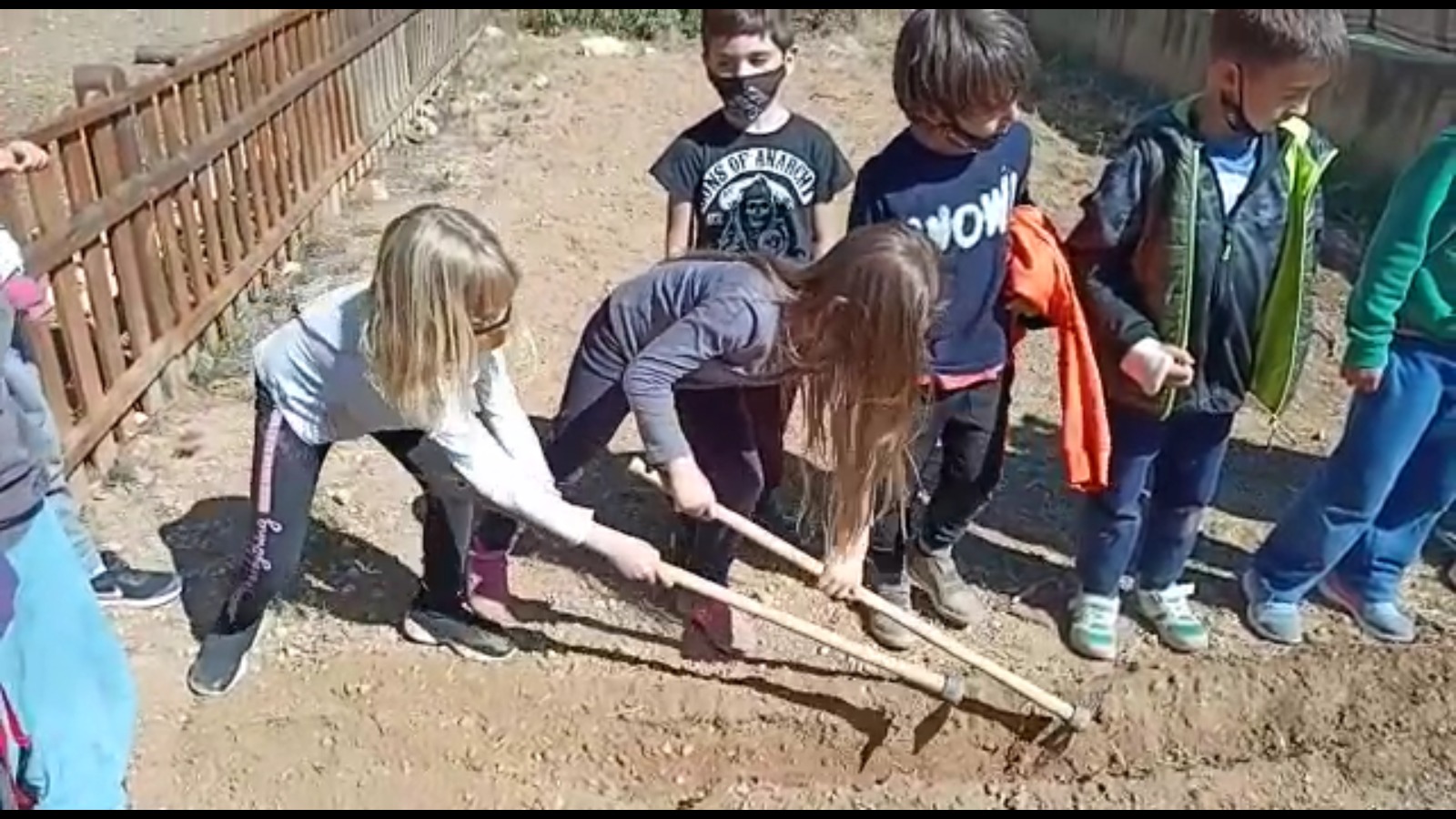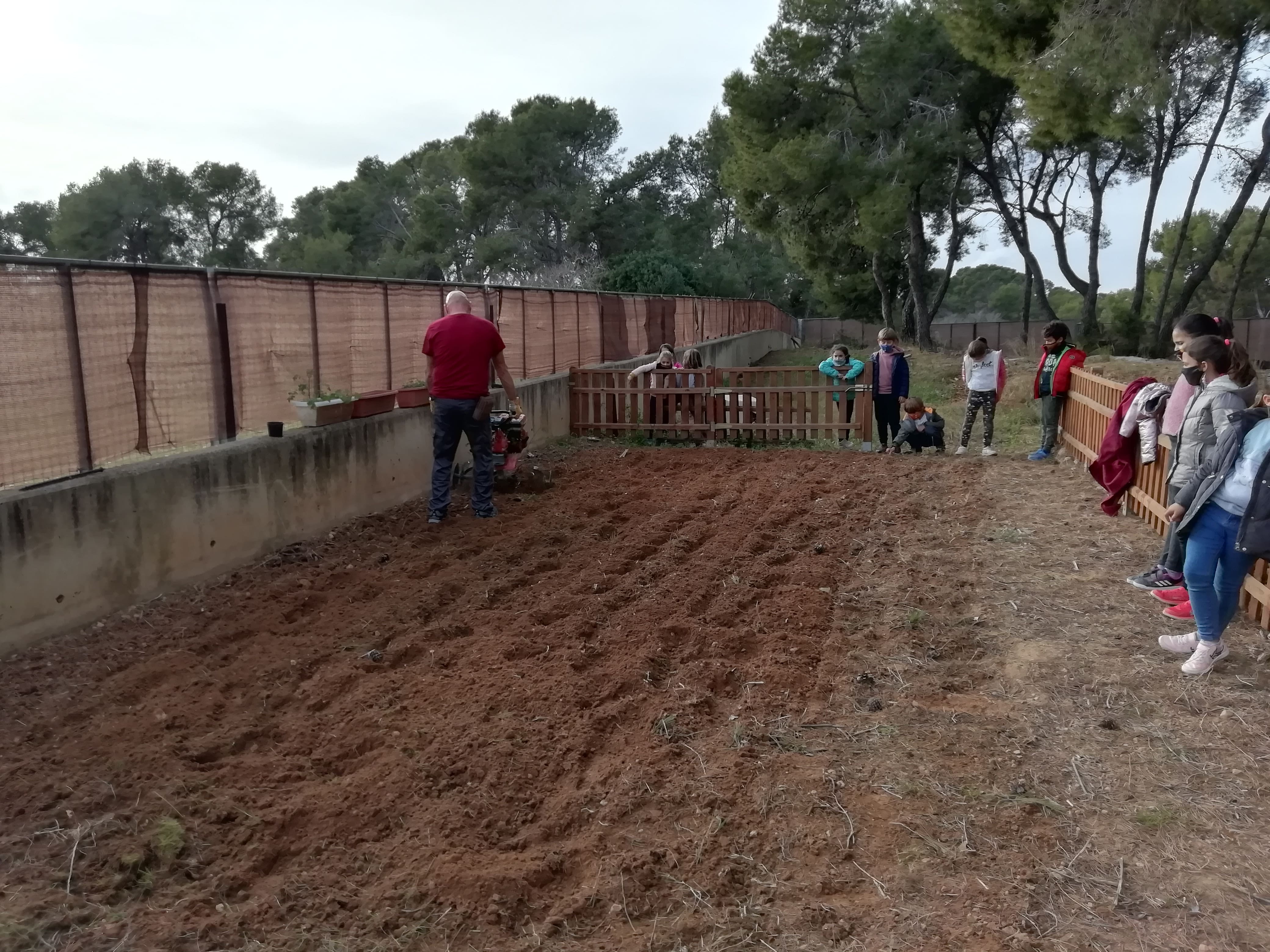 Quan vam pujar a l’hort de l’escola, primer vam haver de treure les males herbes i després li vam dir a l’Àlex que si podia passar el motocultor perquè la terra estigui més toveta i que poguessin créixer bé les plantes. Quan la terra estava ja preparada vam començar a fer els solcs amb una aixada. Una aixada és una eina que en ajuda a picar el terra i remoure-la.