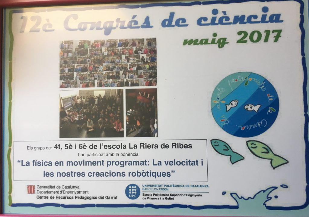 Els nens i les nenes de Segon Cicle de robòtica han extret la física del moviment programat amb Scratch i l’han portat al XIIè Congrés de Ciència el passat 26 de maig a l’UPC. Han portat diferents experiències en dues ponències que han presentat. Les experiències: El Circuit Elèctric; La potència; La Velocitat i les seves creacions robòtiques.