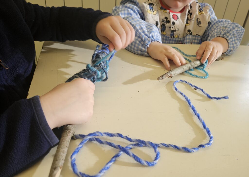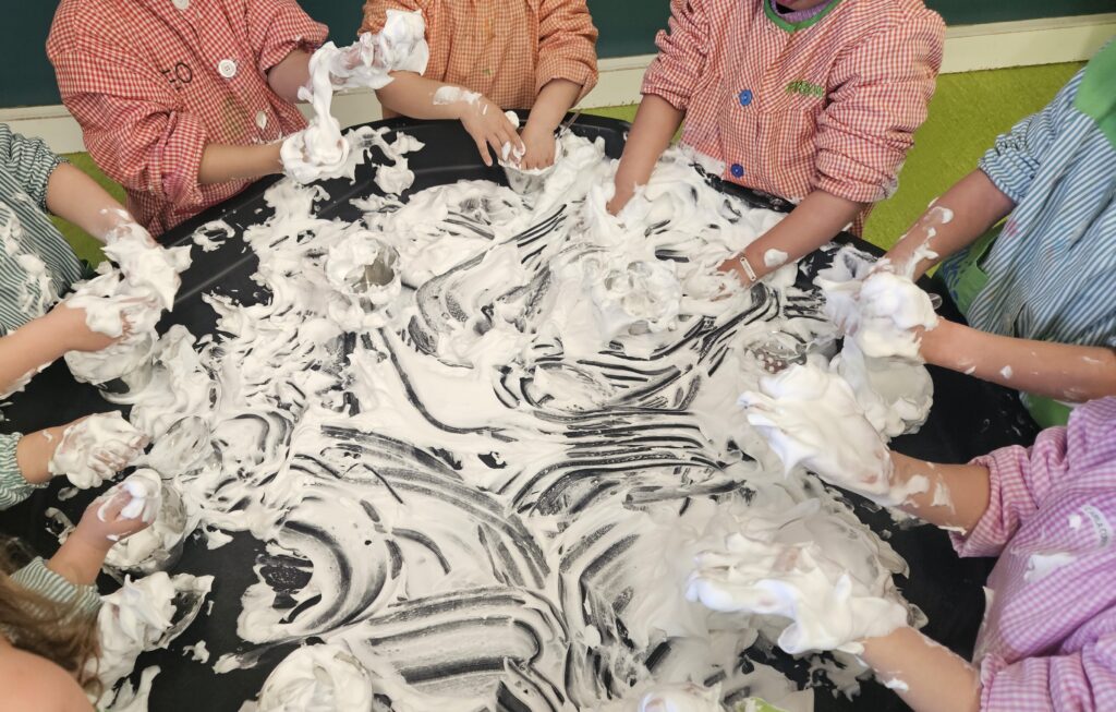 Hem començat explorant materials naturals i textures, enrotllant llanes de colors al voltant de branques per crear uns mòbils ben bonics que decoren l’aula i ens recorden els colors suaus de l’hivern. També hem experimentat amb escuma d’afaitar i bicarbonat, una activitat sensorial que ens ha encantat i ens ha permès tocar, barrejar i observar què passa quan combinem diferents materials.