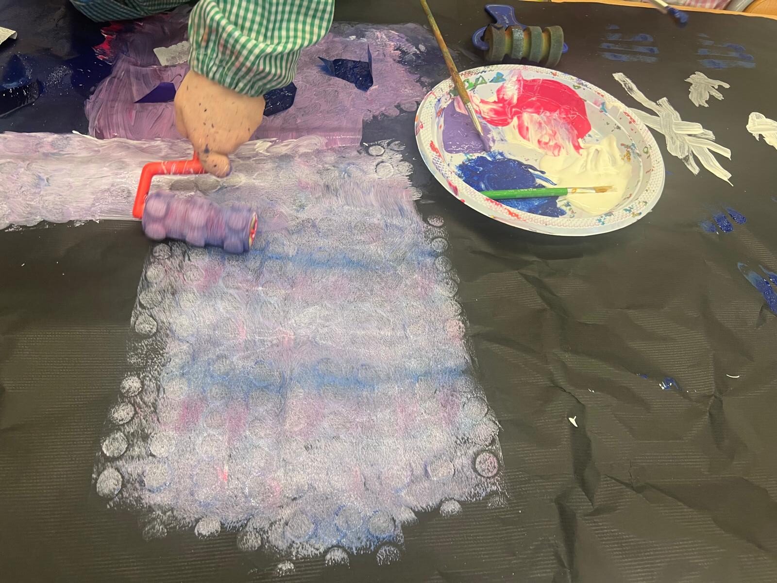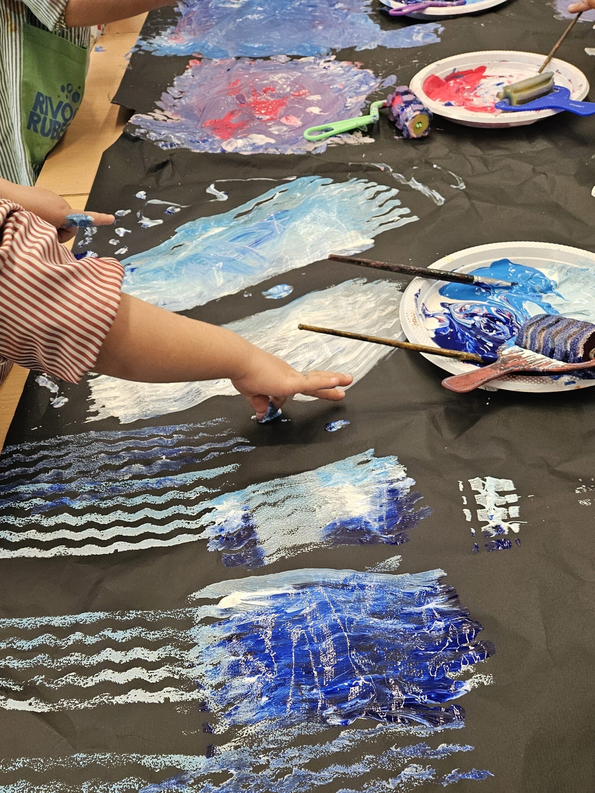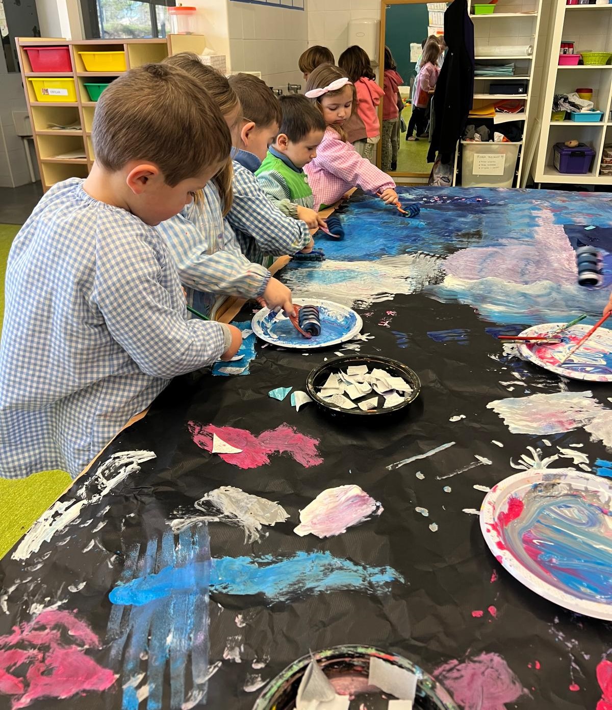 L’hivern ens porta colors freds com el blanc, el blau i el gris. Hem creat murals inspirats en aquesta estació, pintant amb esponges, pinzells i fins i tot amb les mans!